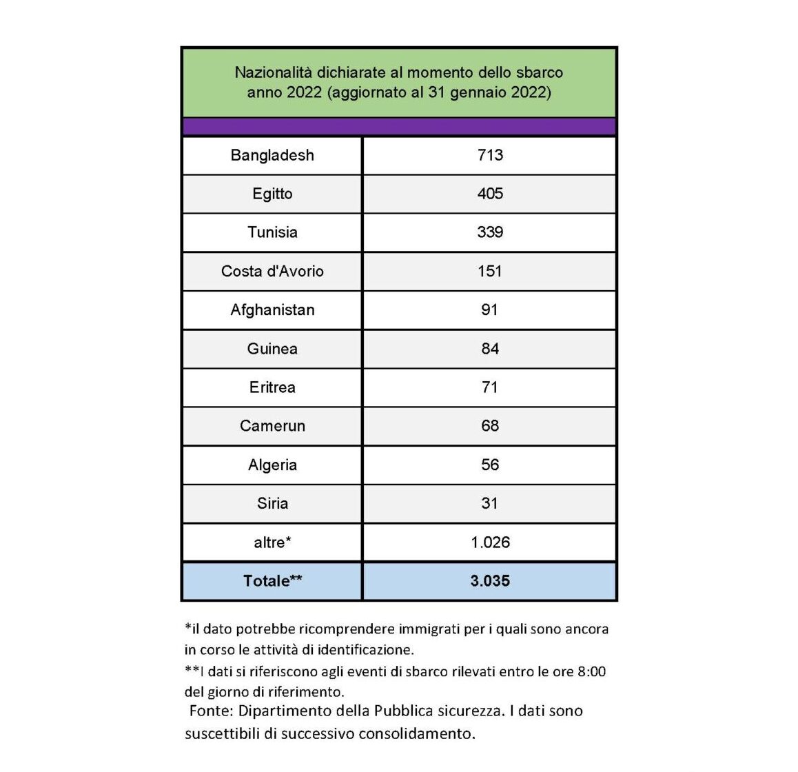 Per quanto riguarda le nazionalità principali, dei 3.305 sbarcati nel mese di gennaio 713 di loro hanno dichiarato di provenire dal Bangladesh (il 34% del totale), 405 dall’Egitto (24%), 339 dalla Tunisia (11%), 151 dalla Costa d’Avorio (5%) e 91 dall’Afghanistan (3%). Da notare anche la presenza di 195 minori non accompagnati sbarcati nel mese di gennaio del 2022.