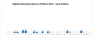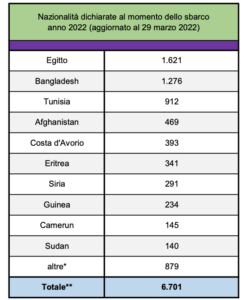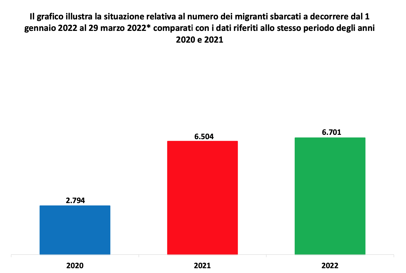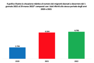 Dall’inizio di gennaio al 29 marzo 2022 sono stati 6.701 i migranti sbarcati in Italia via mare, 1.227 solo nell’ultimo mese: è quanto riporta l’ultimo aggiornamento del cruscotto statistico ministeriale. Numeri più alti rispetto ad un anno fa, quando, nello stesso periodo, i cittadini stranieri sbarcati sulle coste italiane sono stati 6.504 nel 2021. Il doppio ed oltre rispetto al 2020, anno della pandemia, quando il numero di cittadini stranieri sbarcati si attestavano sui 2.794.