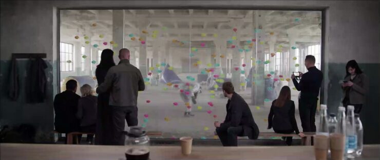 Il tema del riflesso del vetro viene riproposto più avanti nel film quando Serhiy, rilasciato in seguito ad uno scambio di prigionieri, torna nel conforto del proprio salotto, all’apparente serenità della scelta del disco da ascoltare sul proprio giradischi. Il regista propone la scena con inquadratura fissa, esasperando oltre modo i dettagli della minuziosità con cui il protagonista mette in funzione l’apparecchio. Sullo sfondo le luci della città attraverso le ampie finestre. La musica parte, riempendo la stanza. Finalmente la quiete. Dura pochi istanti, interrotta dal colpo improvviso di un uccello che si schianta sul vetro.