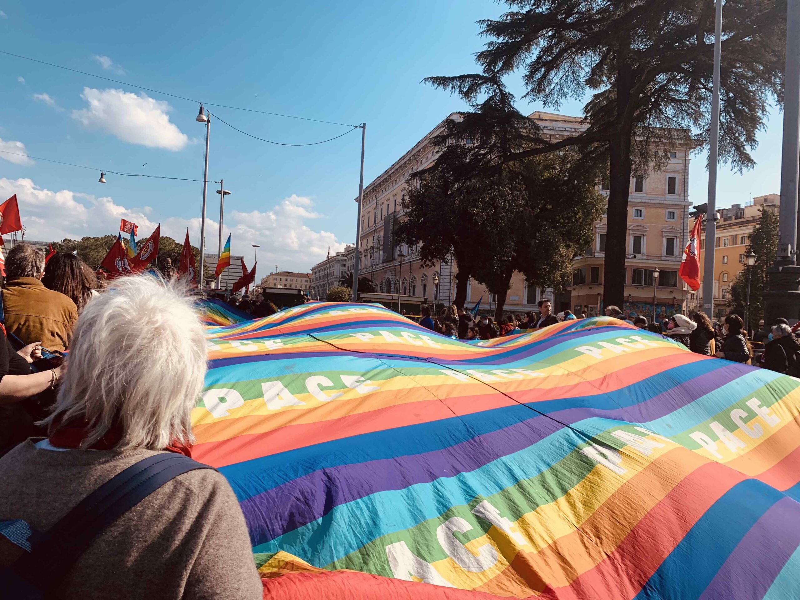 Mai nessun vento fu tanto gradito, per sventolare bandiere e per portare lontano le voci degli oltre cinquantamila manifestanti che oggi, 5 marzo 2022, sono scesi in piazza a Roma in segno di solidarietà nei confronti della popolazione ucraina. La manifestazione “Europe for Peace”, indetta da Rete Italiana Pace e Disarmo, ha raccolto le adesioni di tantissime organizzazioni, sindacati e associazioni, oltre le duecento. Il cordone di manifestanti ha attraversato piazza della Repubblica e l’Esquilino fino a fermarsi in Piazza San Giovanni dove alcuni rappresentanti delle realtà aderenti hanno lanciato messaggi di solidarietà alla popolazione ucraina; alle richieste di una pace immediata si sono aggiunte delle severe condanne nei confronti dei Paesi europei, tra cui l’Italia, che hanno inviato armamenti all’Ucraina. In particolare, in molti hanno sottolineato le responsabilità della Nato, la richiesta di non estendere e reclamato la necessità di un intervento Onu.