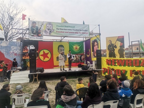 Già a partire dalle 17 di sabato 19 marzo, nello campo Boario dell’ex-mattatoio dove ha sede il centro culturale Ararat, la gente è assiepata attorno al palco allestito per l’occasione. Altri fanno capannello vicino alle bancarelle che offrono cibo tipico curdo. Dei cumoli di legno sono posti al centro dello spiazzo; serviranno verso sera ad appiccare il tradizionale fuoco per il Newroz. La maggior parte dei partecipati è di origine curda, vi sono anche alcuni italiani, soprattutto giovani che verso sera arrivano a gruppetti. Nei muri campeggiano scritte e cartelloni che invocano la liberazione del leader del PKK Abdullah Ocalan dal 1999 imprigionato nell’isola di Imrali. Vi sono anche immagini e parole delle combattenti del Ypj e degli Ypg, l’unità di difesa maschile.