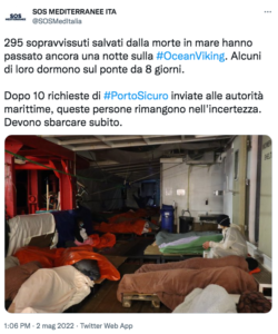 Intanto oggi, 2 maggio 2022, è approdata ad Augusta la Geo Barents, la nave di Medici senza frontiere, con a bordo 101 migranti tratti in salvo il 23 aprile scorso da un barcone in difficoltà a nord-ovest della Libia. Resta invece ancora in mare la Ocean Viking con 295 migranti a bordo, “alcuni di loro dormono sul ponte da 8 giorni. Dopo 10 richieste di #PortoSicuro inviate alle autorità marittime, queste persone rimangono nell’incertezza. Devono sbarcare subito”, si legge in un post di SOS Mediterranee.