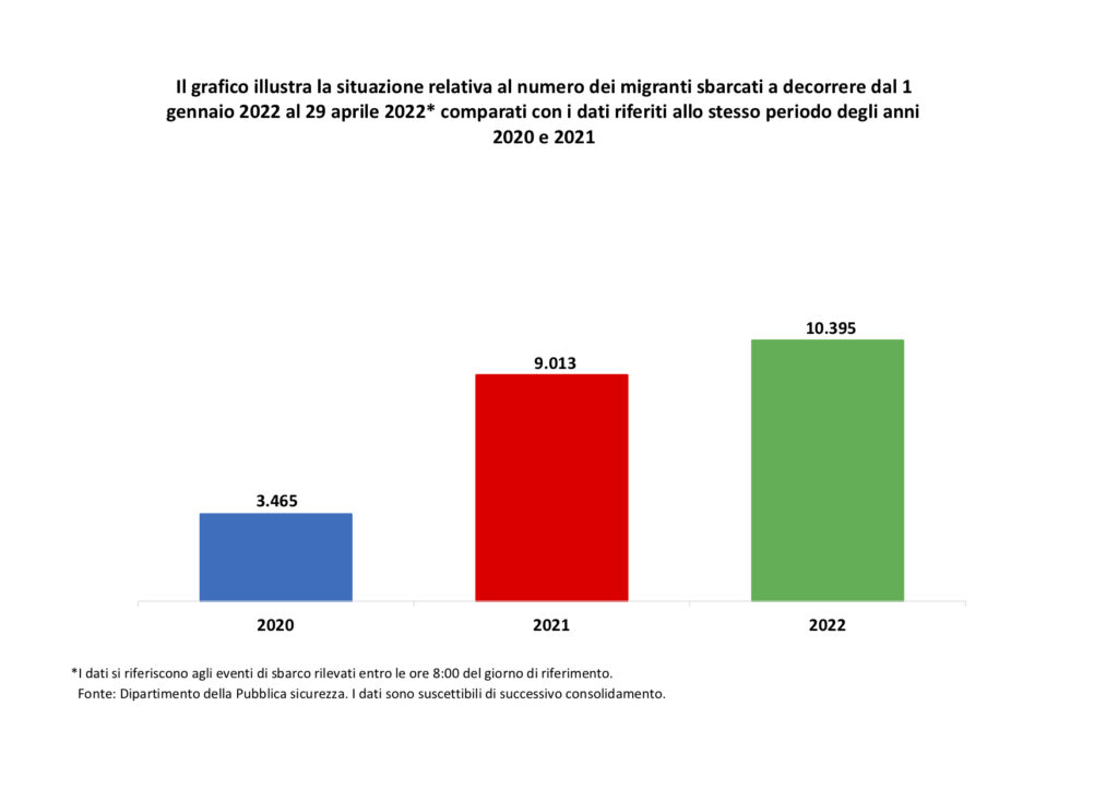 Continuano gli sbarchi. Dal 1 gennaio al 29 aprile 2022 sono sbarcati in Italia 10.395 migranti, 1.382 in più rispetto allo stesso periodo del 2021, quando a sbarcare furono in 9.013, e il triplo rispetto al 2020, anno della pandemia, quando ad approdare sulle nostre coste furono in 3.465.