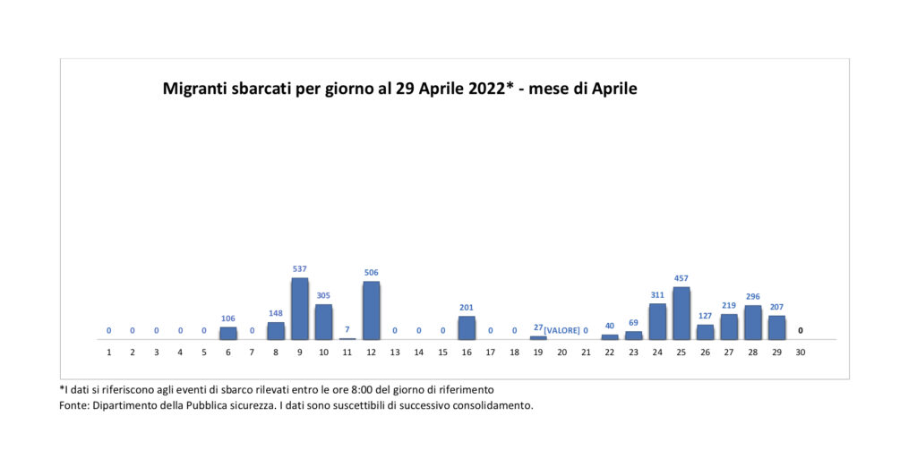 In particolare, secondo quanto riportato dall’ultimo Cruscotto Statistico Giornaliero fornito dal Ministero dell’Interno, nel mese appena concluso sono sbarcate 3.563 persone. I giorni con più arrivi sono stati il 9 aprile, quando sono stati salvati 537 migranti a bordo di diverse imbarcazioni, il 12 con 506 migranti sbarcati a Pozzallo dopo essere stati intercettati a bordo di un peschereccio, e il 25 con 457 migranti, di cui circa 400 arrivati su di un motopesca individuato al largo delle coste siciliane.