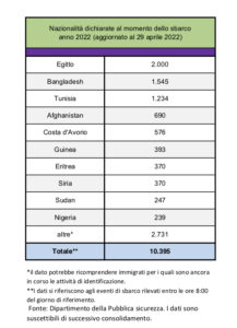 Le prime quattro nazionalità dei migranti per numero di arrivi restano le stesse dei mesi precedenti: su 10.395 migranti arrivati in Italia dall’inizio dell’anno 2.000 sono di cittadinanza egiziana, 1.545 bengalese, 1.234 tunisina e 690 afghana. Da notare anche la presenza di 1.043 minori stranieri non accompagnati, giunti sulle coste italiane dal 1 gennaio al 25 aprile 2022.