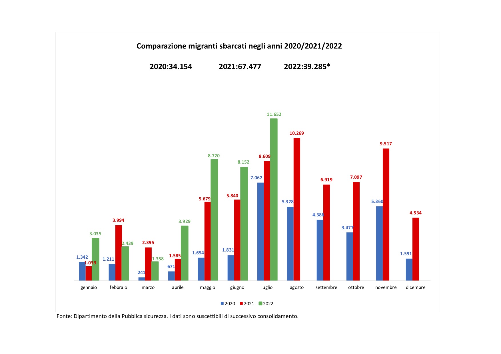 39.285 il numero totale dei migranti che è riuscito ad attraversare il mare e a raggiungere il nostro paese nel 2022 (al 29 luglio), con un aumento di 10.832 migranti sbarcati rispetto al 2021 e 25.949 rispetto al 2020. Un incremento tuttavia contenuto se consideriamo che, già nel 2011, più di 60mila persone sbarcarono sulle coste italiane durante la cosiddetta primavera araba e che nel periodo 2014-2017 il numero di sbarchi salì vertiginosamente, arrivando a 120-180mila migranti giunti via mare l’anno.