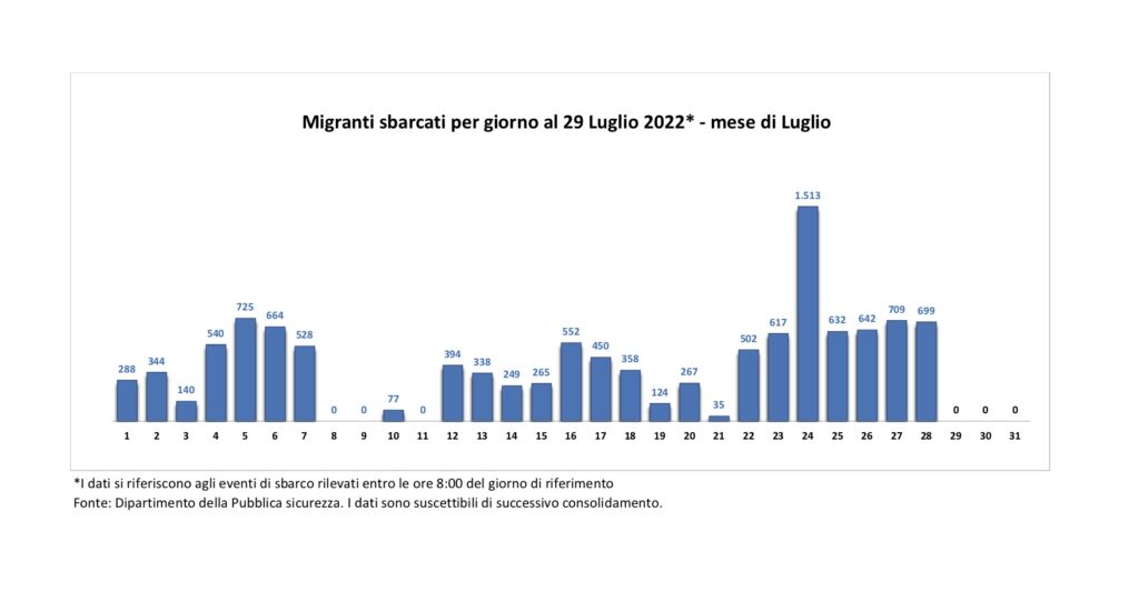 A luglio il giorno con più sbarchi è stato il 24, con 1.513 migranti giunti via mare in Italia. Quel giorno 674 migranti su di un peschereccio alla deriva sono stati salvati da tre motovedette della Guardia Costiera, da un’unità della Guardia di Finanza e da una nave mercantile a circa 124 miglia dalla Calabria. Purtroppo sono state anche trovate cinque persone senza vita.