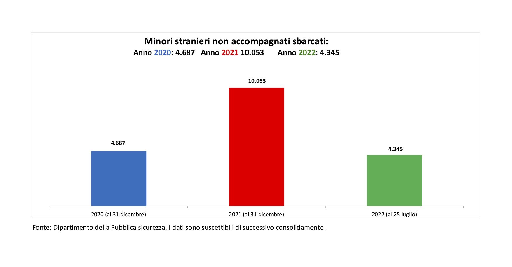 Per quanto riguarda i minori stranieri non accompagnati sbarcati in Italia nel 2022, questi risultano meno della metà dell’anno precedente: 4.345 nel 2022, 10.053 nel 2021.