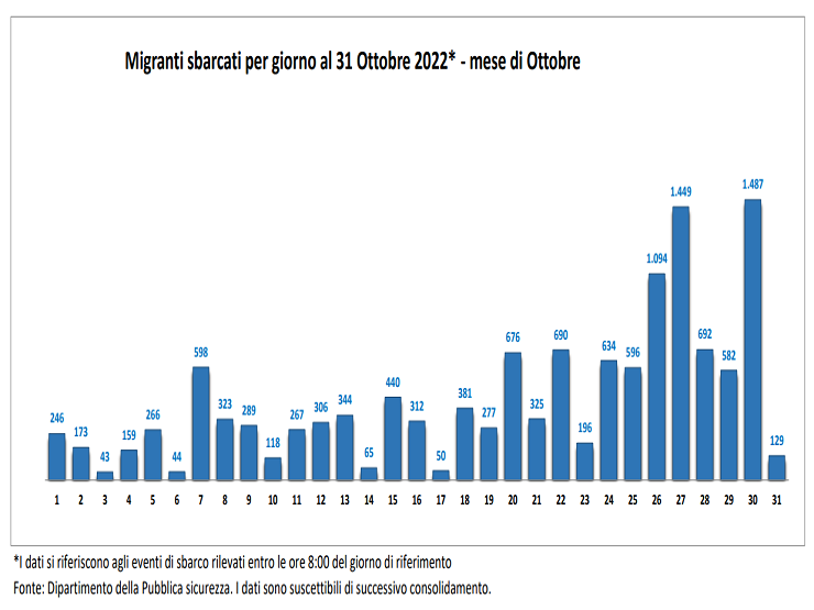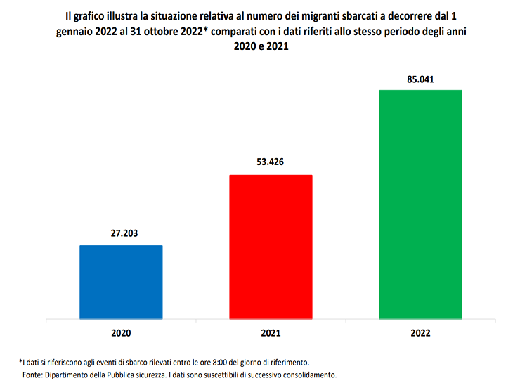 Dal primo gennaio fino al 31 ottobre 2022, il numero totale delle persone che sono riuscite a raggiungere le coste italiane ammonta a 85.041. 31.615 migranti in più in relazione ai medesimi mesi del 2021 e 57.838 in più rispetto allo stesso periodo del 2020. Se paragonata con gli arrivi annuali del 2014-2017, che si aggiravano intorno ai 120.000 – 180.000, la cifra del 2022 risulta ancora abbastanza contenuta.