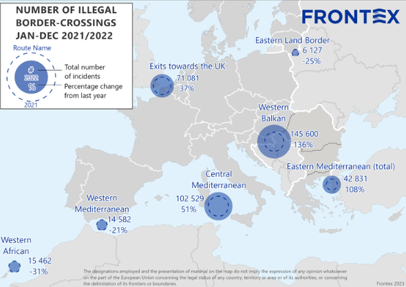 Si tratta di un incremento che, contrariamente a quanto si pensa, non è legato allo scoppio del conflitto in Ucraina: i circa 13 milioni di profughi ucraini, infatti, non sono stati conteggiati da Frontex nel novero degli ingressi dalle frontiere esterne UE, per le eccezionali politiche e pratiche di accoglienza messe in campo dalla stessa Unione.