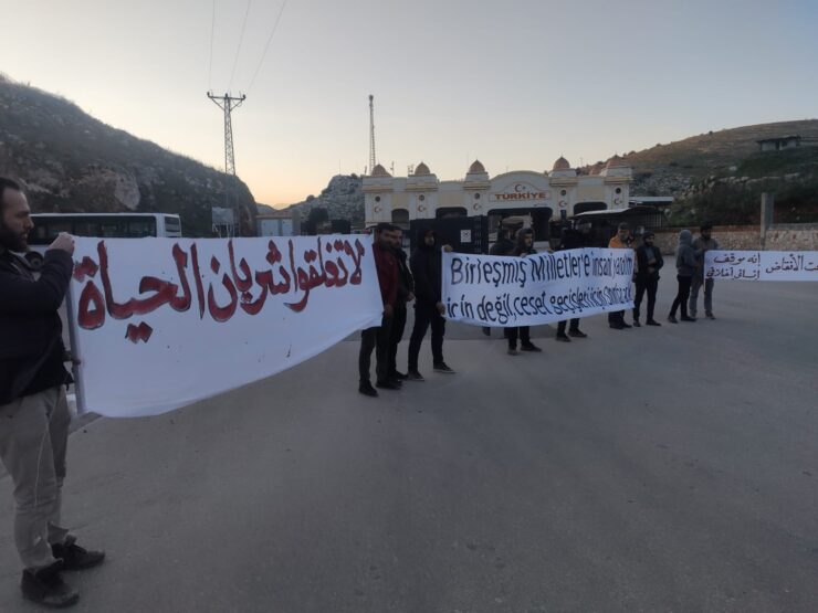 Manifestanti con striscioni sul confine tra Turchia e Siria che chiedono aiuti per il terremoto