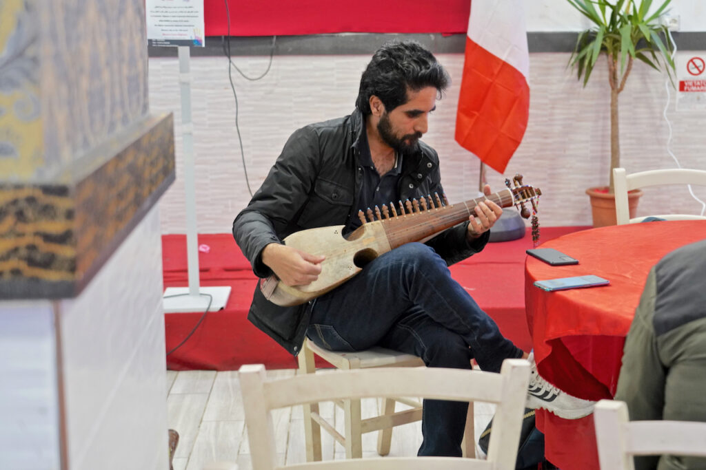 Un giovane uomo entra nel locale portando con sé uno strumento a corde, ignoto per i canoni occidentali, ma tipico della musica classica afghana, il rubab.