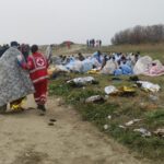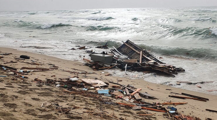 parte del relitto sulla spiaggia di Cutro con mare sullo sfondo