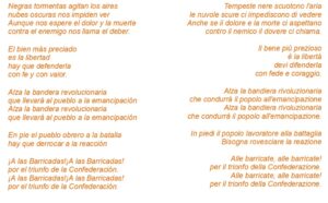 Le “nere tormente” che agitano l’aria sono una chiara allusione ai regimi nazi-fascisti europei, mentre la Confederazione richiamata nel finale è un riferimento alla Confederación Nacional del Trabajo (CNT), il più grande sindacato anarchico spagnolo.
