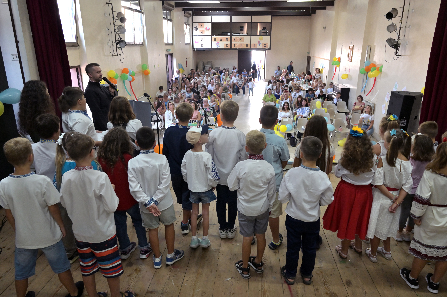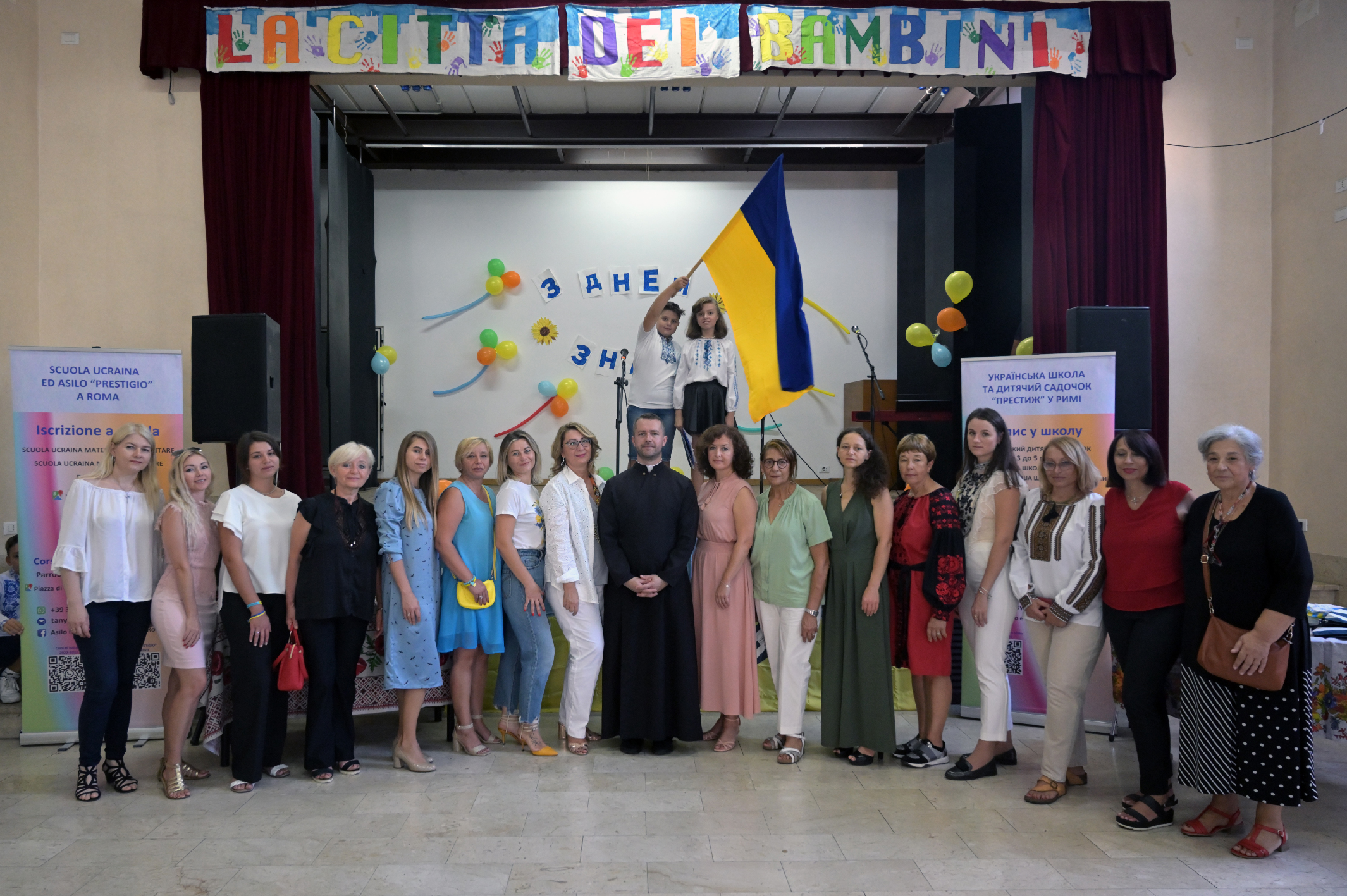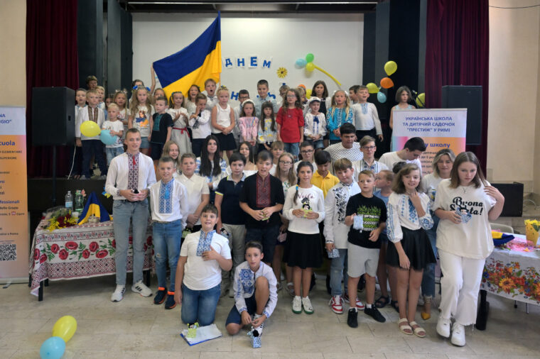 “La festa del primo campanello è molto importante in Ucraina, perchè il campanello simboleggia l’apertura dell’anno scolastico” esordisce Tetyana Tarasenko, presidente della scuola ucraina Prestigio di Roma. “Siamo molto grati alla parrocchia Santa Maria delle Grazie al Trionfale, che ci ha accolto nel Teatro dell’oratorio, per questo bellissimo evento”.
