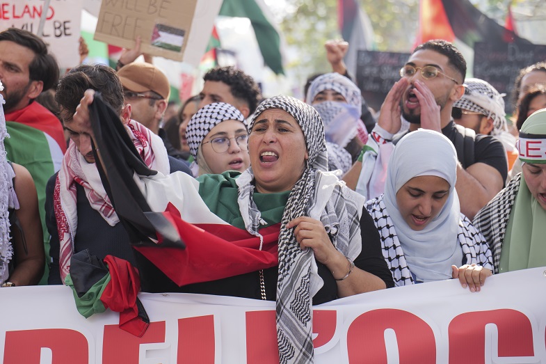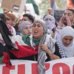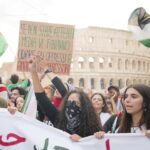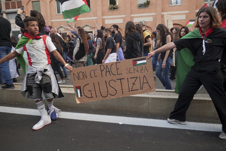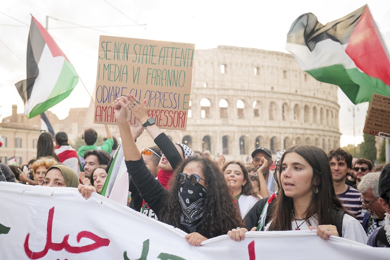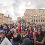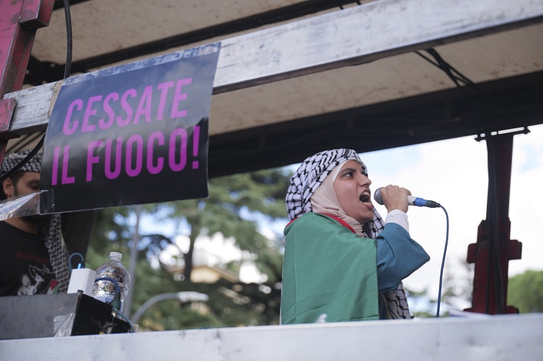 Un fiume di persone, soprattutto giovani — palestinesi, arabi, italiani, donne, tante donne — hanno sfilato, per più di 4 ore, da Porta San Paolo a Piazza San Giovanni per dire stop alla guerra, per l’immediato cessate il fuoco a Gaza, come ha già fatto l’ONU senza successo, e per il riconoscimento dei diritti del popolo palestinese. Non è dato sapere il numero, come in genere accade per le manifestazioni pubbliche, dalle 20mila alle 100mila secondo le diverse fonti non ufficiali.