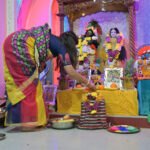 Una donna bengalese abbigliata a festa versa del latte sulle statuine sacre