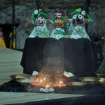 All’ingresso del magnifico anfiteatro, realizzato interamente in tufo, probabilmente tra gli ultimi decenni del II sec. a C. ed i primi anni del I sec. d.C., alle 18 del pomeriggio, con il sole che ancora illumina e tinge di giallo quella che una volta era una delle due porte d’ingresso e la cavea, Ganga ed una sua allieva sono impegnate ad allestire il palco. Sul retro, accostate al podio, elemento di separazione tra l’arena e le gradinate, le altre ragazze hanno cominciato a prepararsi e ad adornare il palcoscenico con candele profumate e petali di fiori. Sistemate in un angolo le divinità induiste della città di Puri, nell’Orissa, Jagannath, Subadra, Baladeva. -Jagannath è una delle forme del dio Kṛiṣṇa, Subadra e Baladeva sono i suoi fratelli- vengono omaggiate con candele, fiori e piccoli doni. Nel backstage si provano i passi di danza, si sciolgono i muscoli con esercizi ginnici, si comincia a raccogliere i capelli, a truccarsi. Si aprono i teli di colori brillanti, prevalentemente giallo-oro, per i Sari che si indosseranno in scena e che, sapientemente, vengono passati intorno alla vita per scendere ad avvolgere morbidamente entrambe le gambe, quel tanto da consentire tutta la gamma dei movimenti che prevede la danza Odissi. Ogni protagonista si decora la fronte con il Bindi o Bindu la goccia rossa, in questa occasione impreziosita da strass, a simboleggiare l’energia, il terzo occhio, il punto di raccoglimento energetico in cui il manifesto e il non manifesto si incontrano.