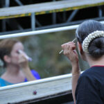 Enrica, arrivata dalla Calabria, vive a Roma dove insegna Yoga e fa la performer, mentre sistema le candele sul palcoscenico racconta “Lavoro nel settore dello spettacolo, mi occupo anche di arte circense. Ho letto l’annuncio di Ganga che invitava le danzatrici a partecipare ad un seminario finalizzato alla creazione dello spettacolo sulla femminilità e sulla preghiera e ho deciso di partecipare. Insieme a me c’erano altre danzatrici provenienti da altre parti del mondo: dall’India, dal Cile, dagli Stati Uniti, siamo state ospitate a casa di Ganga e abbiamo ballato nel suo studio e chiacchierato nel suo giardino. È stato molto bello incontrare tante persone diverse accumunate dallo stesso fine e dagli stessi interessi: l’amore per l’India e per la danza, intesa da Ganga come offerta spirituale agli altri e a Dio, ognuno al suo Dio.Mi auguro di poter continuare a collaborare con Ganga” conclude, mentre continua a preparare le lucerne e a spargere petali di fiori colorati.