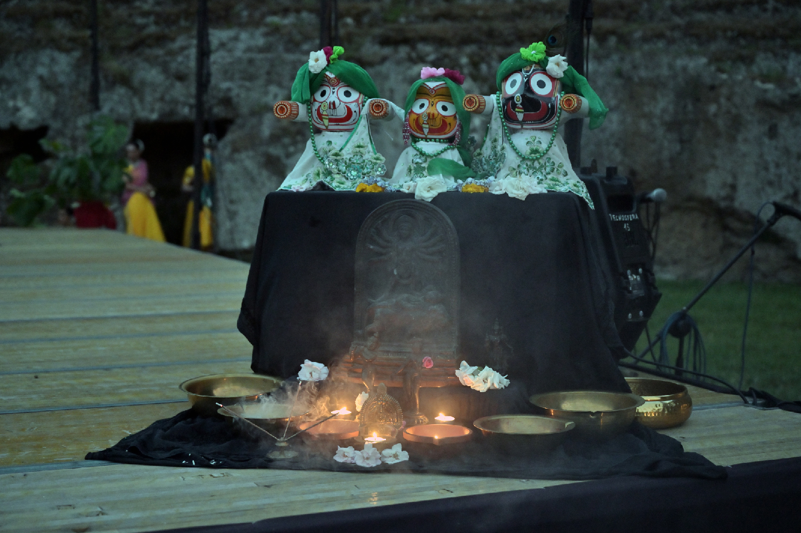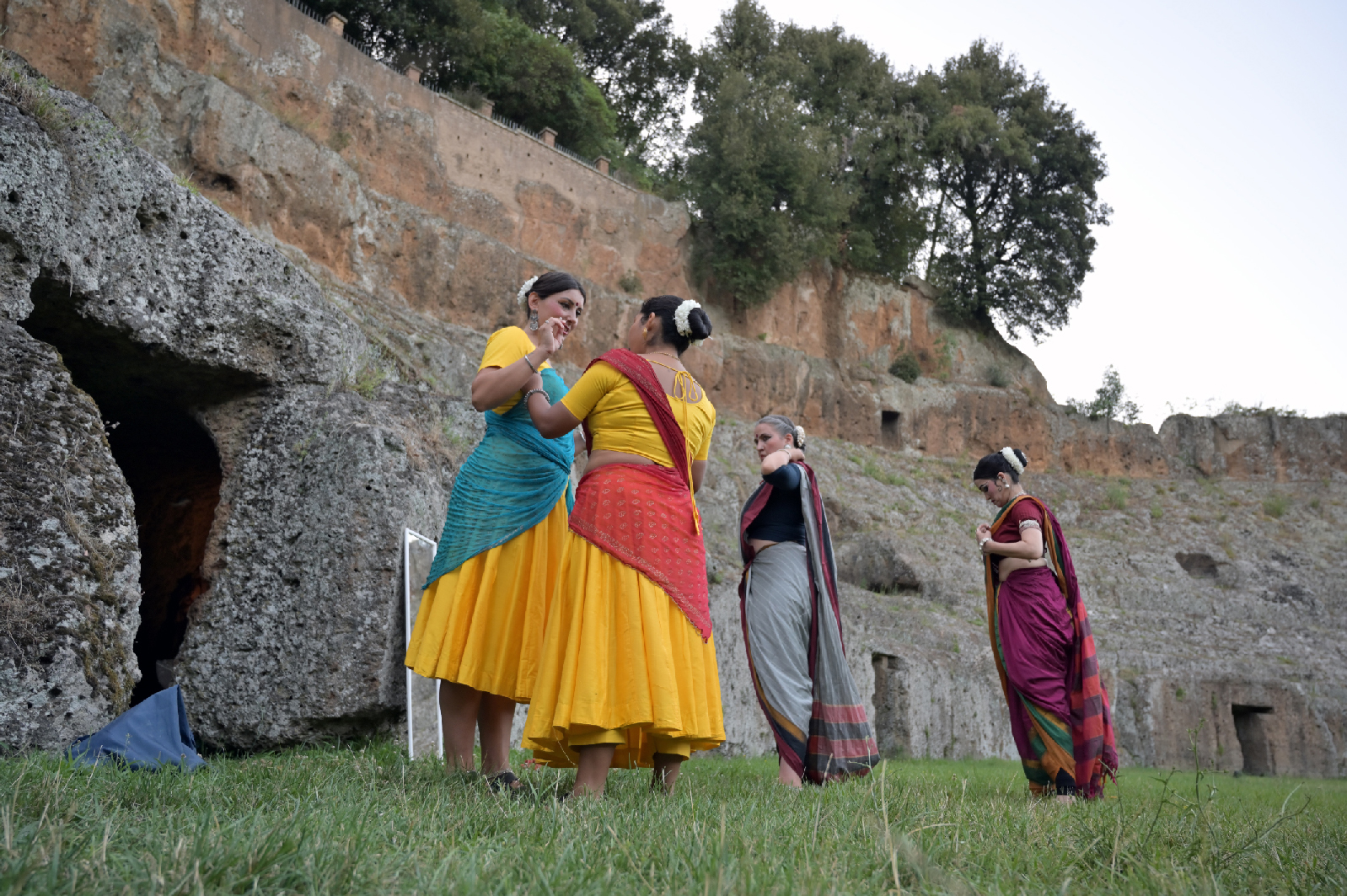 All’ingresso del magnifico anfiteatro, realizzato interamente in tufo, probabilmente tra gli ultimi decenni del II sec. a C. ed i primi anni del I sec. d.C., alle 18 del pomeriggio, con il sole che ancora illumina e tinge di giallo quella che una volta era una delle due porte d’ingresso e la cavea, Ganga ed una sua allieva sono impegnate ad allestire il palco. Sul retro, accostate al podio, elemento di separazione tra l’arena e le gradinate, le altre ragazze hanno cominciato a prepararsi e ad adornare il palcoscenico con candele profumate e petali di fiori. Sistemate in un angolo le divinità induiste della città di Puri, nell’Orissa, Jagannath, Subadra, Baladeva. -Jagannath è una delle forme del dio Kṛiṣṇa, Subadra e Baladeva sono i suoi fratelli- vengono omaggiate con candele, fiori e piccoli doni. Nel backstage si provano i passi di danza, si sciolgono i muscoli con esercizi ginnici, si comincia a raccogliere i capelli, a truccarsi. Si aprono i teli di colori brillanti, prevalentemente giallo-oro, per i Sari che si indosseranno in scena e che, sapientemente, vengono passati intorno alla vita per scendere ad avvolgere morbidamente entrambe le gambe, quel tanto da consentire tutta la gamma dei movimenti che prevede la danza Odissi. Ogni protagonista si decora la fronte con il Bindi o Bindu la goccia rossa, in questa occasione impreziosita da strass, a simboleggiare l’energia, il terzo occhio, il punto di raccoglimento energetico in cui il manifesto e il non manifesto si incontrano.