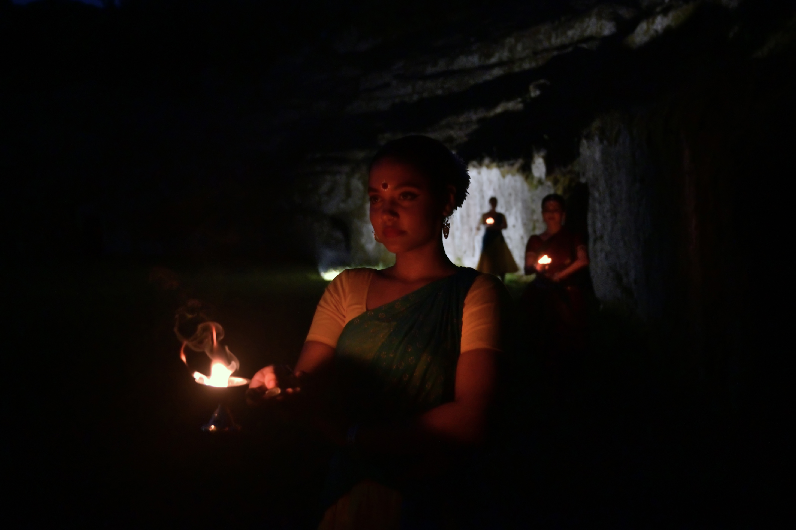 Quando finalmente cala il sole e comincia ad arrivare il pubblico, le ballerine si raccolgono per un momento di concentrazione prima di esibirsi; si accendono le candele poste sul perimetro del palco e quelle che delimitano la platea degli spettatori, partono le basi musicali e Govi, compagno di Ganga, introduce ogni singolo ballo, spiegandone il significato.