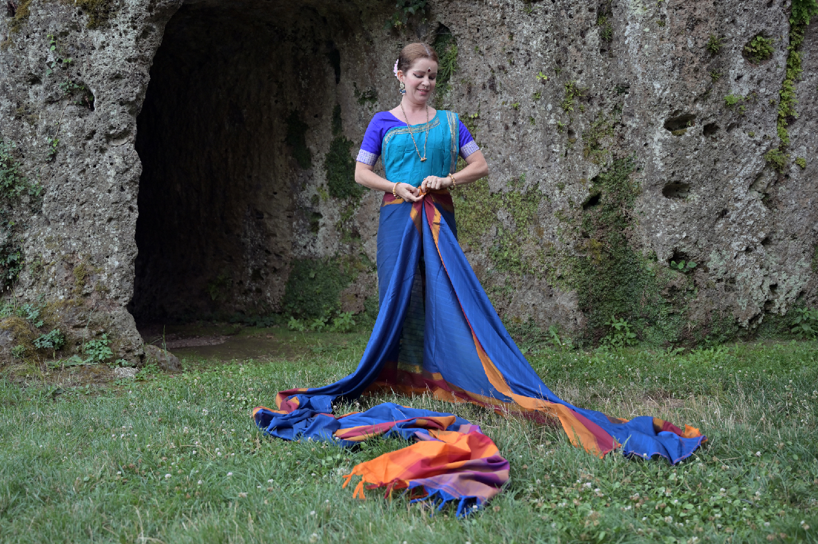 Ganga ha due begli occhi neri, un viso dolce ed un portamento da ballerina, parla solo qualche parola d’italiano, si esprime in inglese “Quando ho visto questo anfiteatro per la prima volta ho subito pensato che avrei voluto realizzare in questo luogo antico uno spettacolo di danza sacra.” Ganga ha vissuto in India e negli Stati Uniti, è arrivata in Italia 4 anni fa. A Nepi ha creato, all’interno della sua casa, una scuola dove insegna yoga e danza indiana, disegna abiti, conduce seminari e workshop di danza Odissi e Bharatnatyam, per diffondere la cultura, la spiritualità indiana e la meditazione. “L’anno scorso abbiamo realizzato qui il primo spettacolo, scelgo sempre uno spazio sacro, per i miei spettacoli” e poi rivela “perché siamo fuori dai Templi e questa danza è essenzialmente arte rituale, un modo per ricongiungersi con la spiritualità che è dentro di noi e diffonderla, farne dono a chi la guarda”.
