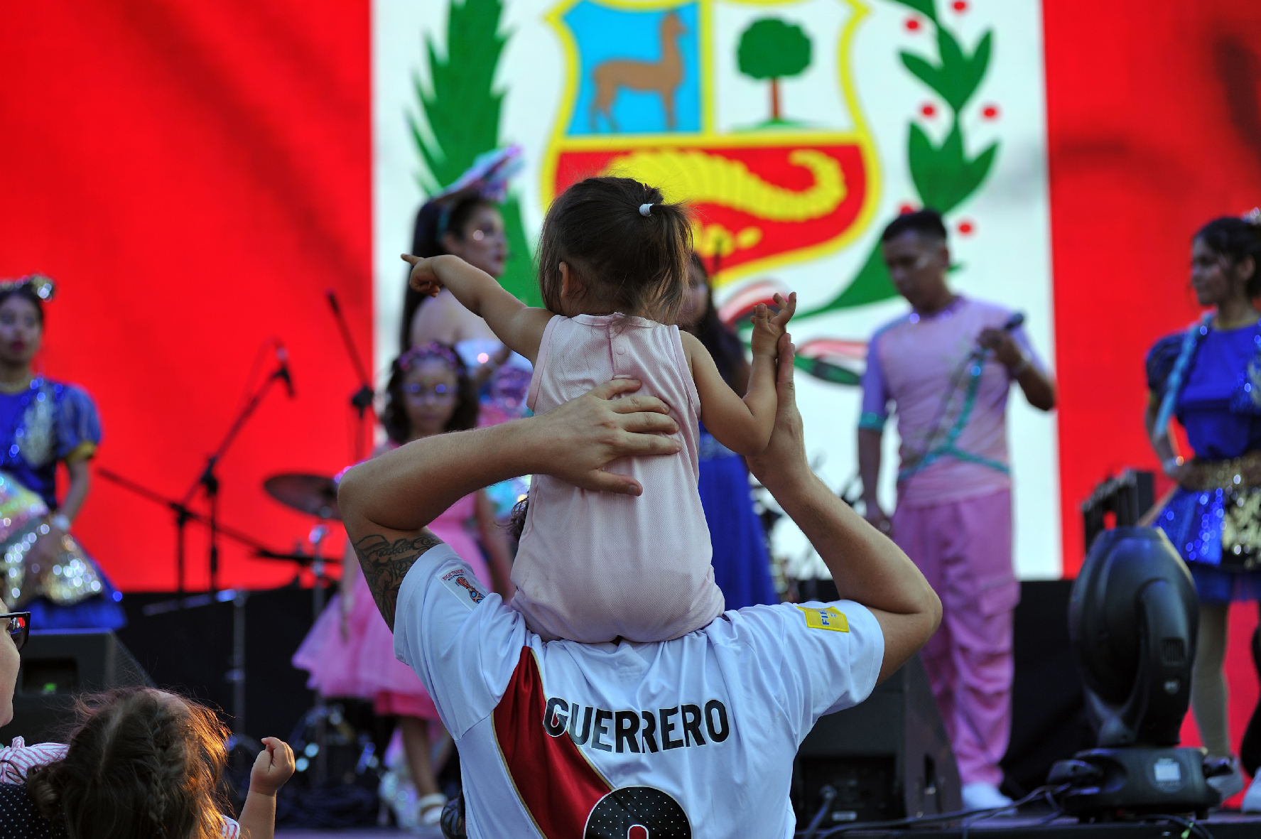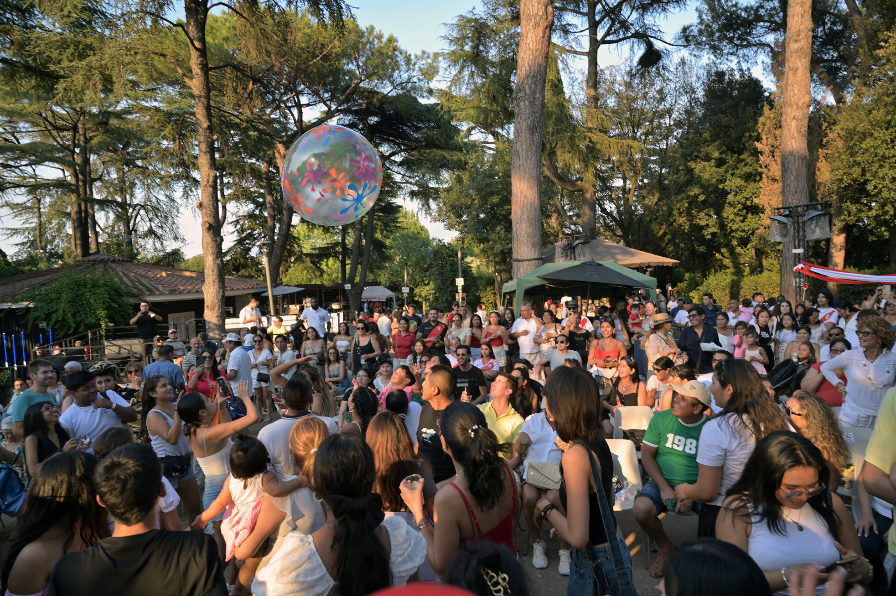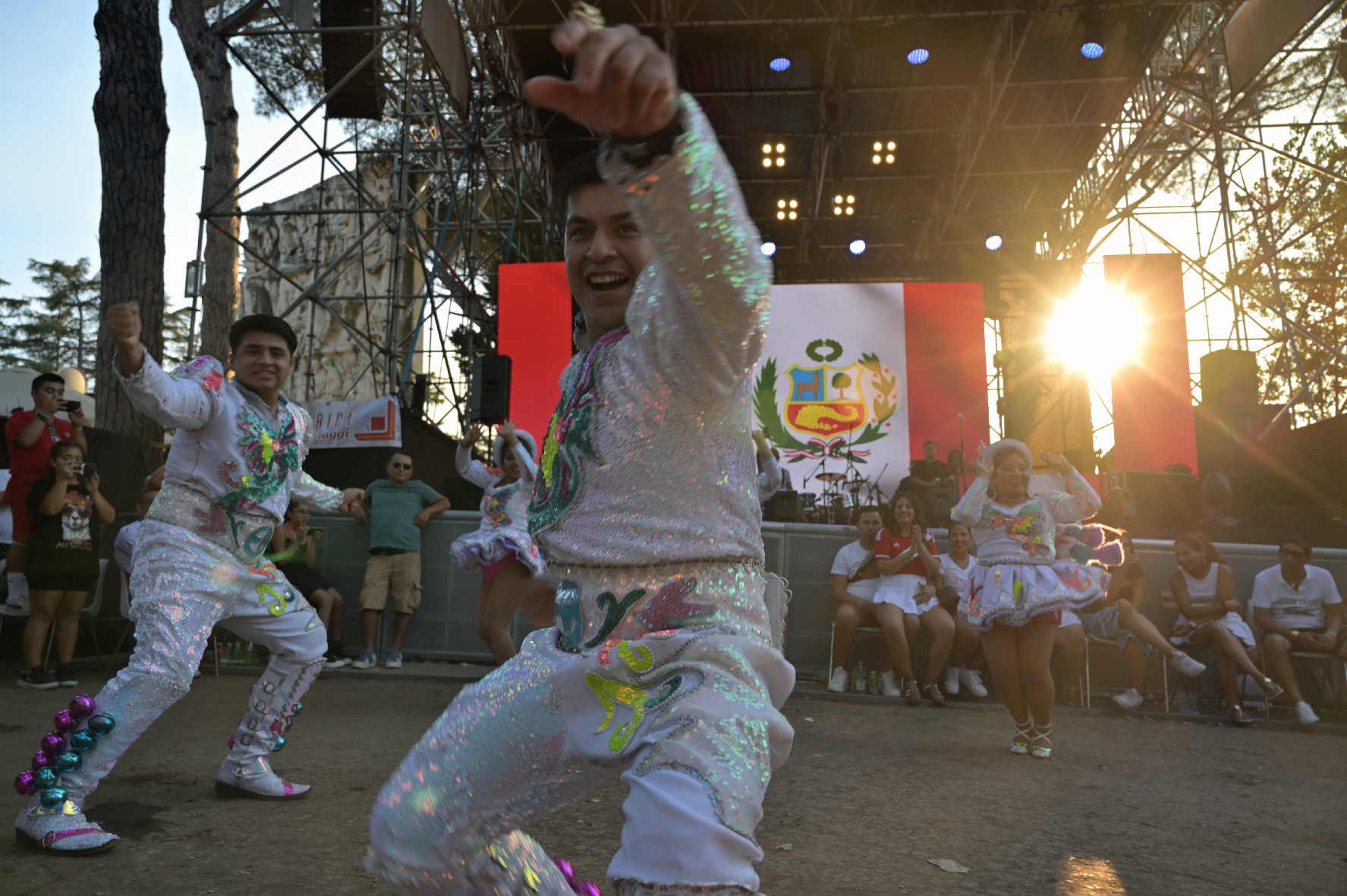 Al centro dell’ampio spazio dedicato alla festa c’è un grande palco con schermi giganti che proiettano la bandiera del Perù. Nel corso della festa è lì che si esibiranno gli artisti che riproporranno le tradizioni peruviane. Sulla destra dell’arena si trovano una fila di stand gastronomici e sulla sinistra un grande chiosco di bevande, superato il quale è stata allestita una vasta area con tavolini e sedie per mangiare e bere in comodità.