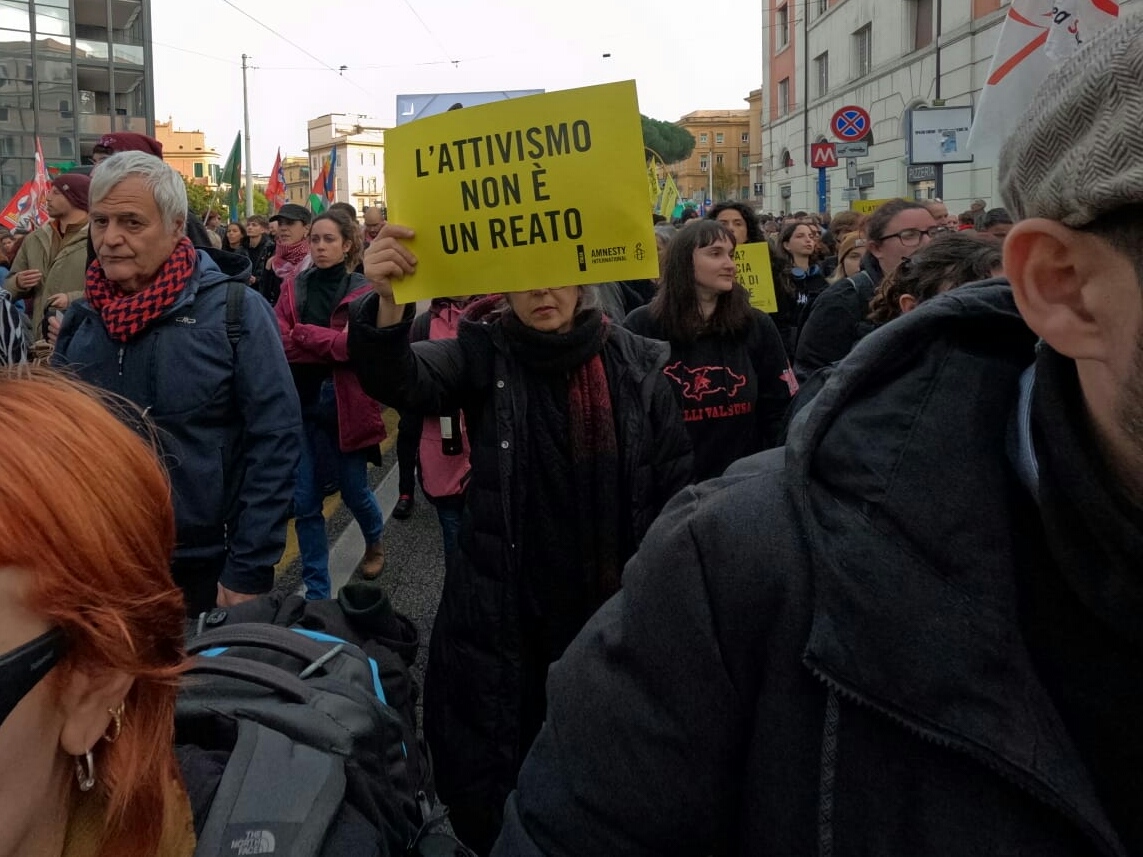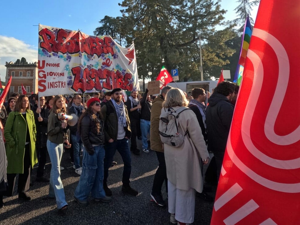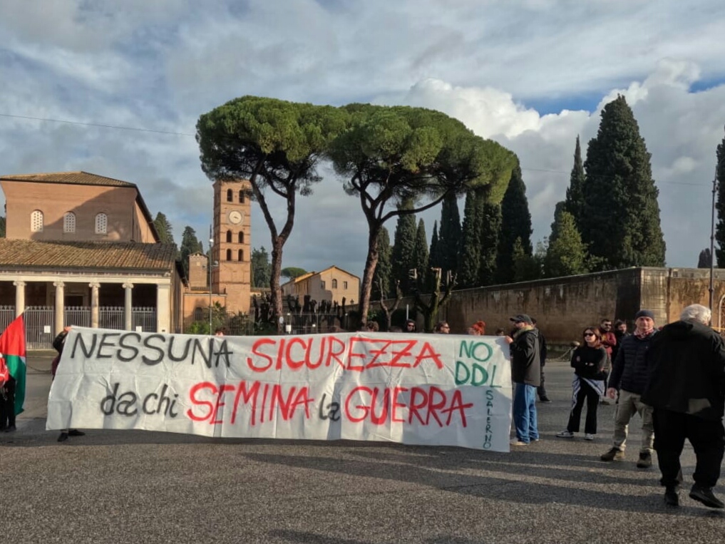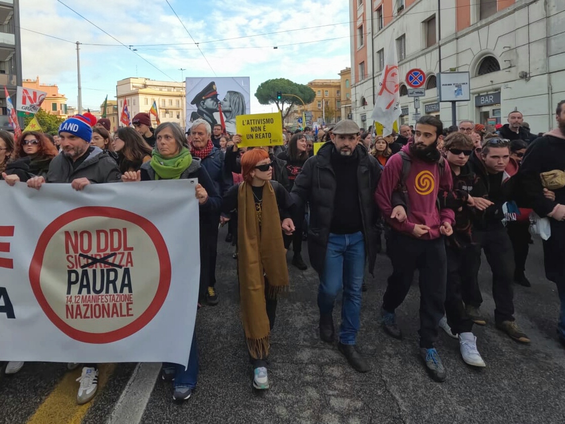 La manifestazione contro il ddl sicurezza ha sfilato per le vie di Roma nel pomeriggio di sabato 14 dicembre. Un lungo corteo è partito dal piazzale del Verano per giungere a piazza del Popolo. Cinquantamila i partecipanti secondo gli organizzatori, settemila per le forze dell’ordine, oltre 200 le associazioni e le forze aderenti, inclusi tutti i partiti dell’opposizione con ANPI, Collettivo di Fabbrica GKN, ARCI, FIOM, FLC, FLAI, numerosi centri sociali provenienti da diverse regioni, Greenpeace, per citarne solo alcune, tanti anche gli studenti. Tanti gli striscioni e gli slogan contro l’attuale governo e le sue disposizioni, il più emblematico di tutti, quello alla testa del corteo, una grande caricatura raffigurante un bacio tra Giorgia Meloni e Benito Mussolini.