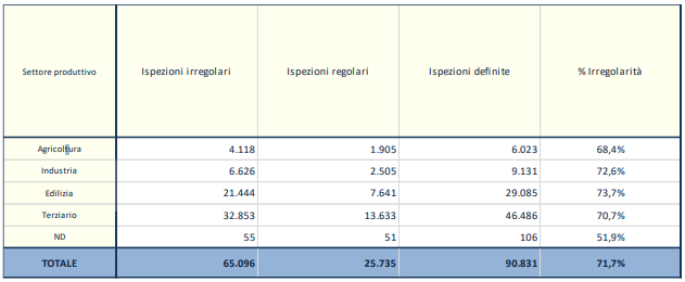Il Rapporto annuale dell’attività di vigilanza in materia di lavoro, pubblicato nel 2024 dall’Ispettorato Nazionale del Lavoro, riporta le conclusioni tratte in seguito a 129.188 ispezioni effettuate nel corso dell’anno, durante le quali è stato individuato un numero considerevole di aziende non in regola con la normativa vigente. Sono stati accertati, infatti, 80.245 illeciti, con un tasso di irregolarità del 74%. Nel corso del 2024 sono aumentati i lavoratori che hanno commesso delle violazioni, pari a 120.442, circa il 15% in più dell’anno precedente. Sono state accertate 83.330 violazioni in materia di salute e sicurezza, il 127% in più rispetto al 2023.