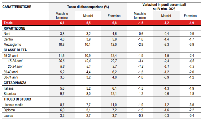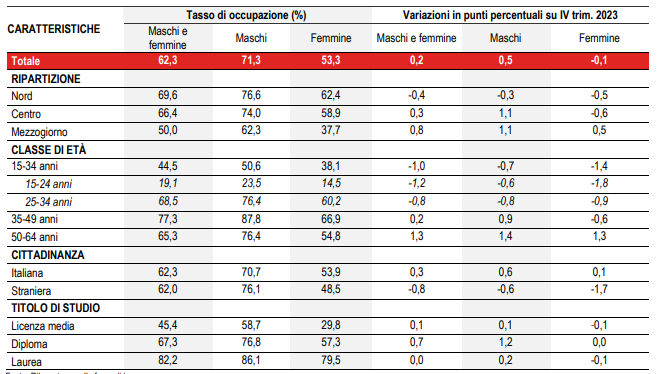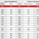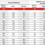 Secondo le rilevazioni effettuate dall’Istat in merito all’anno 2024, il numero di occupati è rimasto sostanzialmente stabile rispetto all’anno precedente, aumentando dell’1,5%, mentre è calato il numero di disoccupati del 14,6%. È salito invece il numero degli inattivi dai 15-64 anni dello 0,5%. La stessa dinamica si riscontra nel tasso di occupazione che è rimasto stabile a 62,2%, il tasso di disoccupazione che è sceso a 6,5% e quello di inattività che è salito a 33,4%.