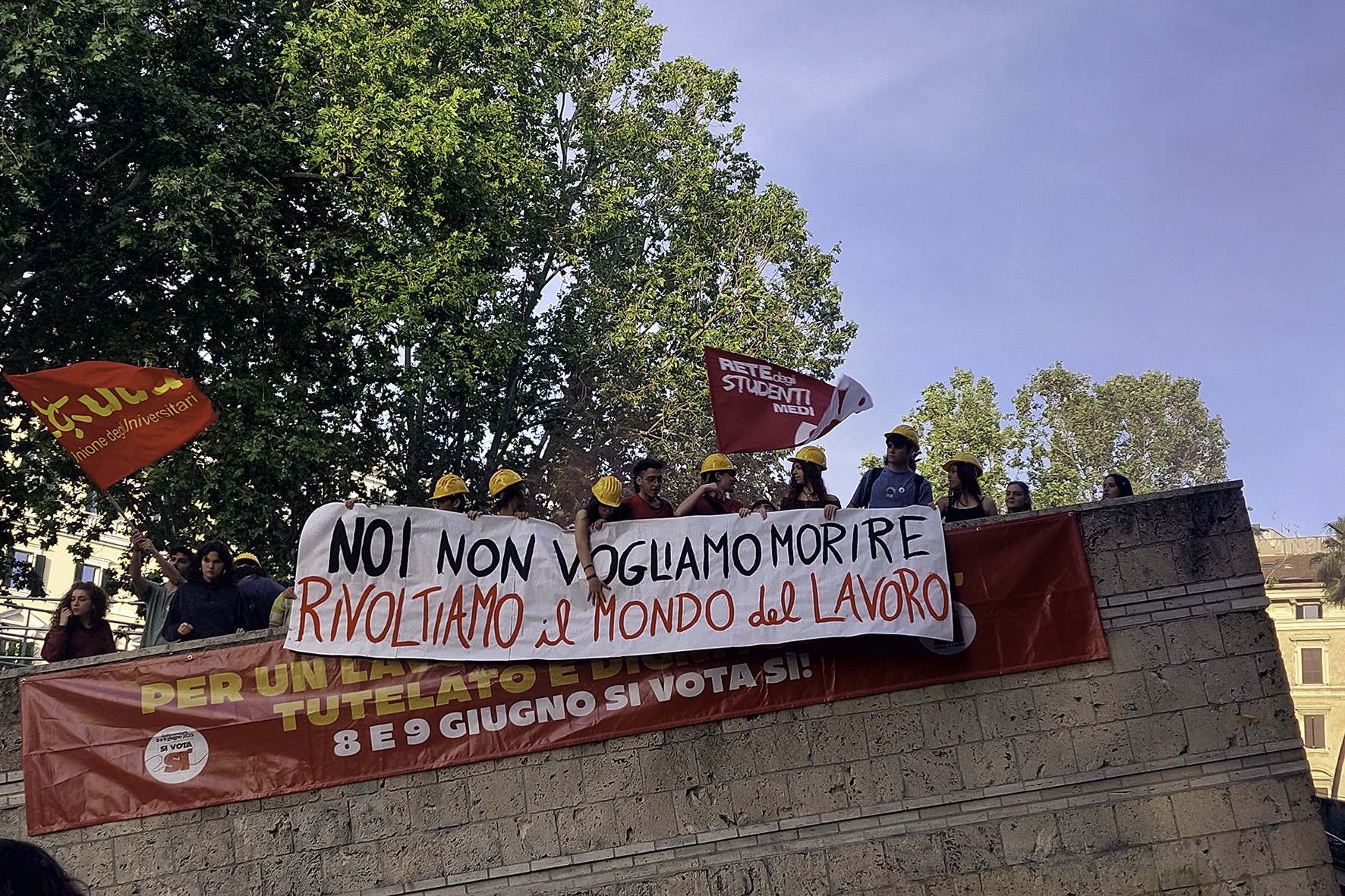 Anche Bianca Piergentili, del Comitato studenti medi per il Sì, ha ricordato Anna Chiti, ennesimo nome che si aggiunge alla lista di 25 mila persone morte dal 2005 ad oggi, le chiamano morti bianche, altre volte incidenti, ma sono omicidi di Stato. “Sono qui a rappresentare chi della mia generazione sceglie di non arrendersi ad una società che uccide. Noi non vogliamo morire” dice, mentre i suoi compagni, indossando i caschetti gialli da cantiere, hanno srotolato uno striscione contenete le stesse parole, lungo il muro che delinea la piazza.
