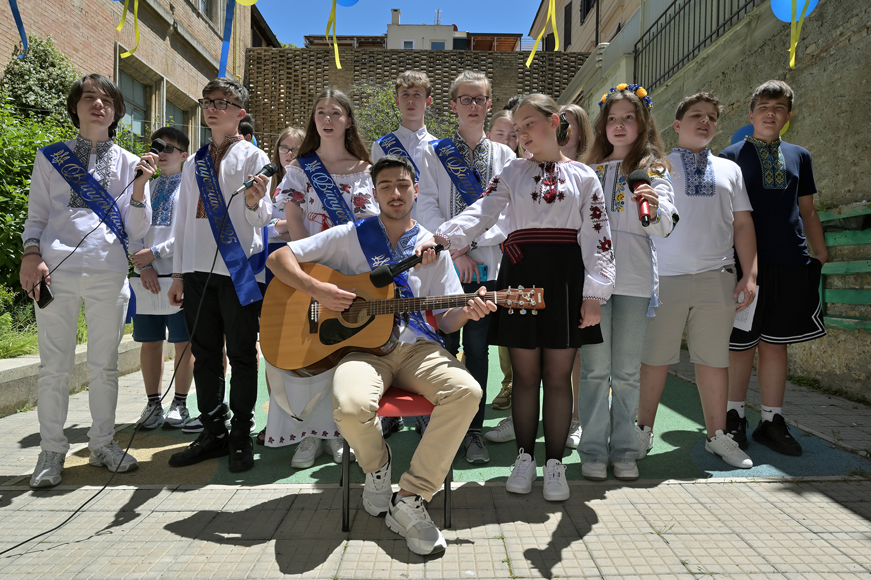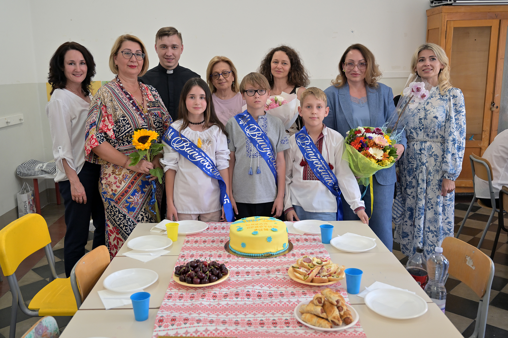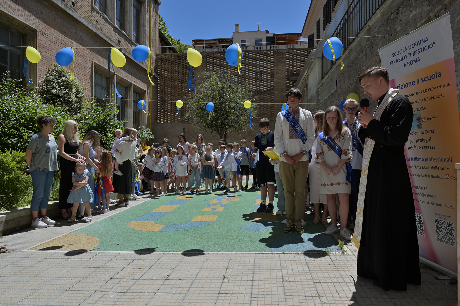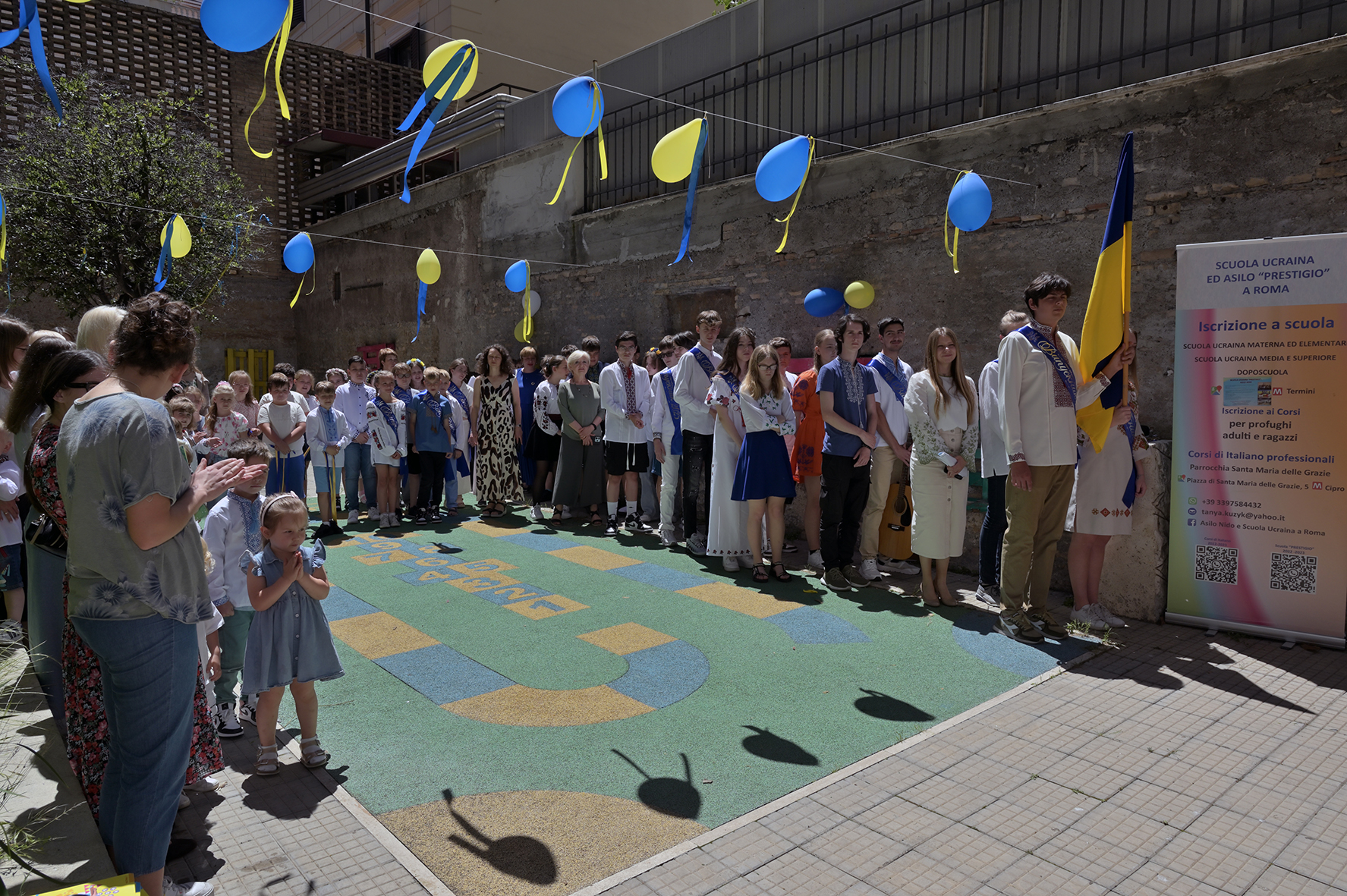 Nel frattempo, sul palco allestito nel cortile, dopo le parole ben auguranti del vice parroco della Chiesa Ucraina dei Santi Sergio e Bacco, nel quartiere Monti, si susseguono le classi. I ragazzi hanno cominciato ad esibirsi, piccoli e grandi recitano poesie, raccontano le loro esperienze, si esibiscono in canti popolari. Il sole picchia forte e arrossa le guance bianche dei bimbetti della scuola materna che però, nonostante il gran caldo, resistono e cantano la loro canzone ricevendo in cambio gli attestati di fine corso e un gioco, per il loro impegno. Nastrini blu e gialli, i colori della bandiera ucraina, spuntano ovunque, mentre il vessillo dell’Ucraina fa il suo ingresso solenne con i ragazzi più grandi, accompagnato dall’inno nazionale e dall’emozione dei presenti che si alzano in piedi in segno di omaggio.