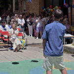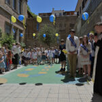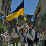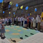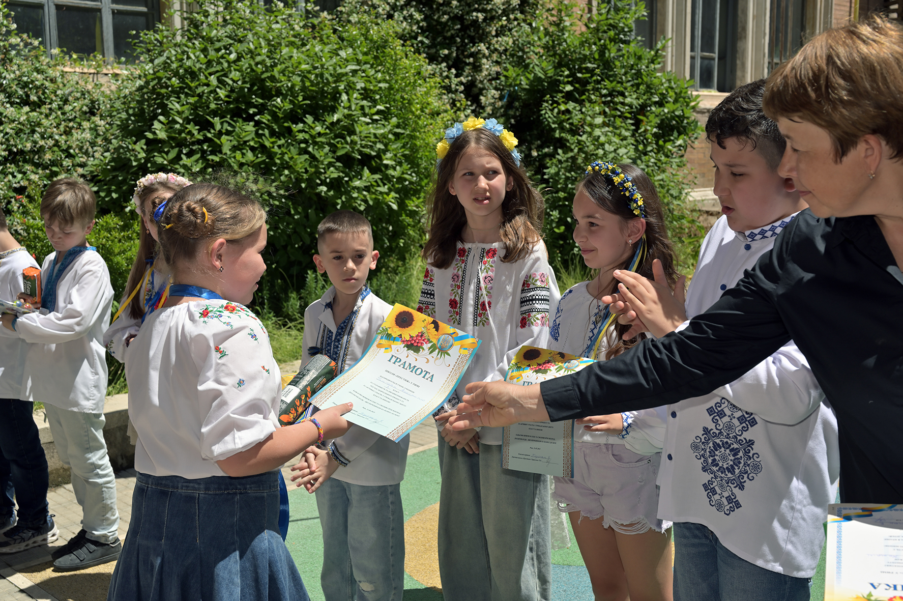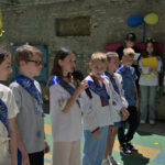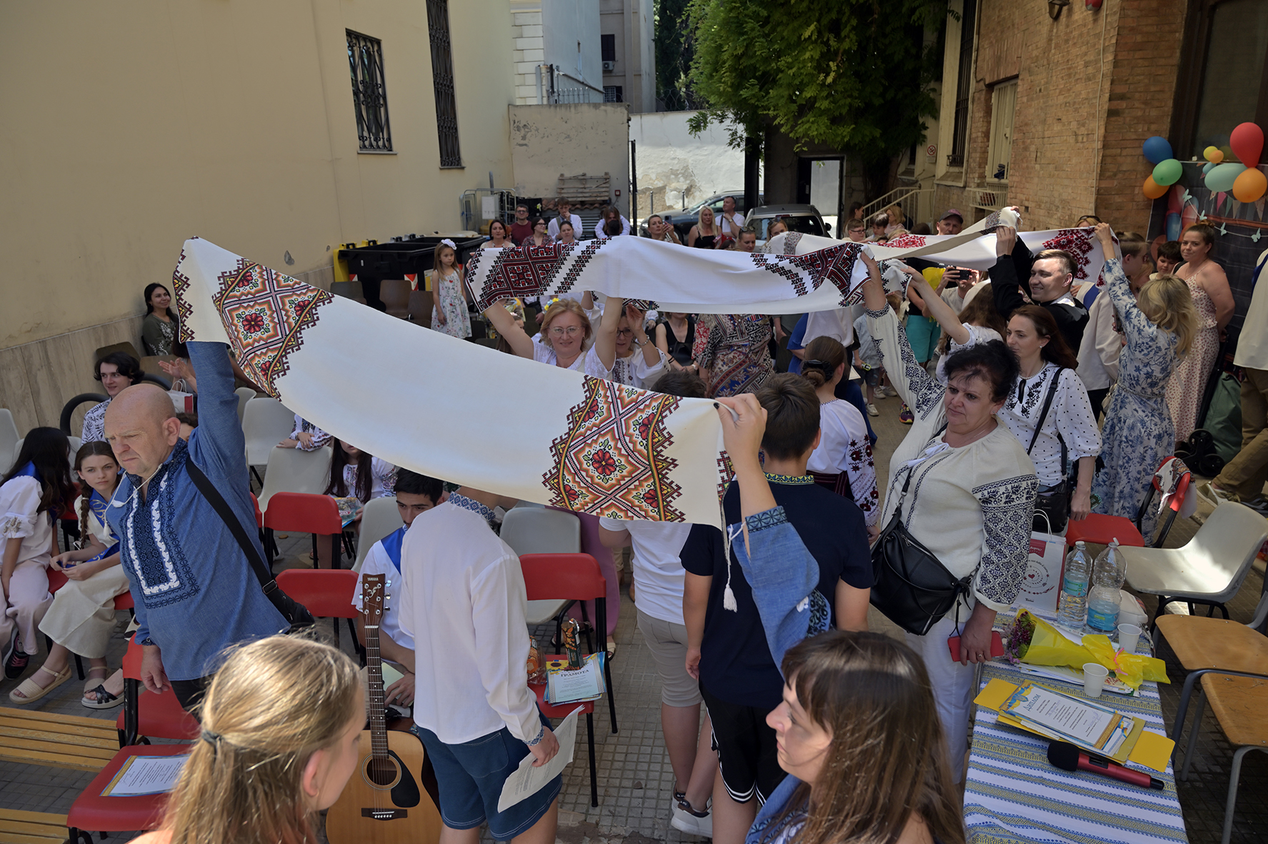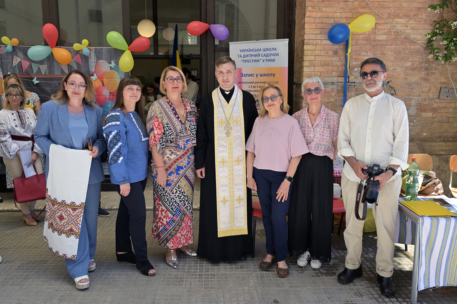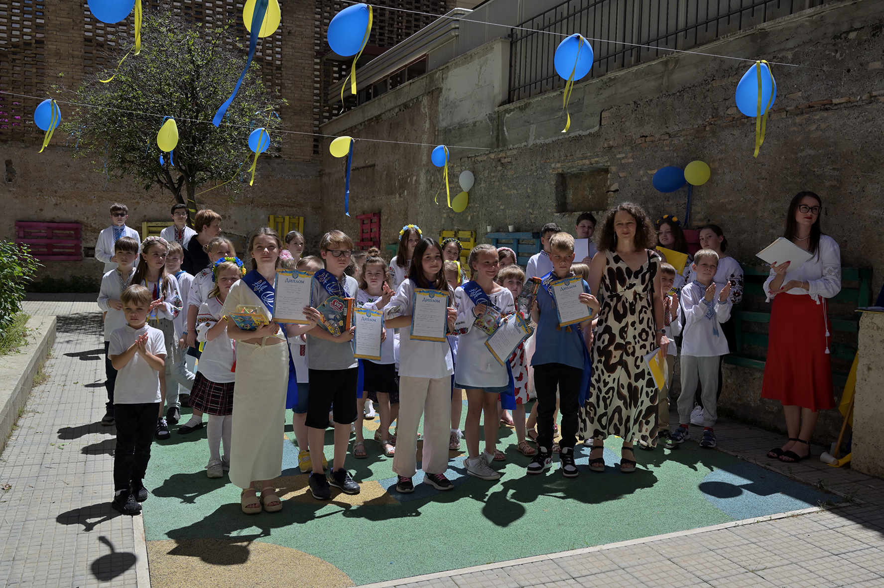 Nel frattempo, sul palco allestito nel cortile, dopo le parole ben auguranti del vice parroco della Chiesa Ucraina dei Santi Sergio e Bacco, nel quartiere Monti, si susseguono le classi. I ragazzi hanno cominciato ad esibirsi, piccoli e grandi recitano poesie, raccontano le loro esperienze, si esibiscono in canti popolari. Il sole picchia forte e arrossa le guance bianche dei bimbetti della scuola materna che però, nonostante il gran caldo, resistono e cantano la loro canzone ricevendo in cambio gli attestati di fine corso e un gioco, per il loro impegno. Nastrini blu e gialli, i colori della bandiera ucraina, spuntano ovunque, mentre il vessillo dell’Ucraina fa il suo ingresso solenne con i ragazzi più grandi, accompagnato dall’inno nazionale e dall’emozione dei presenti che si alzano in piedi in segno di omaggio.