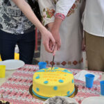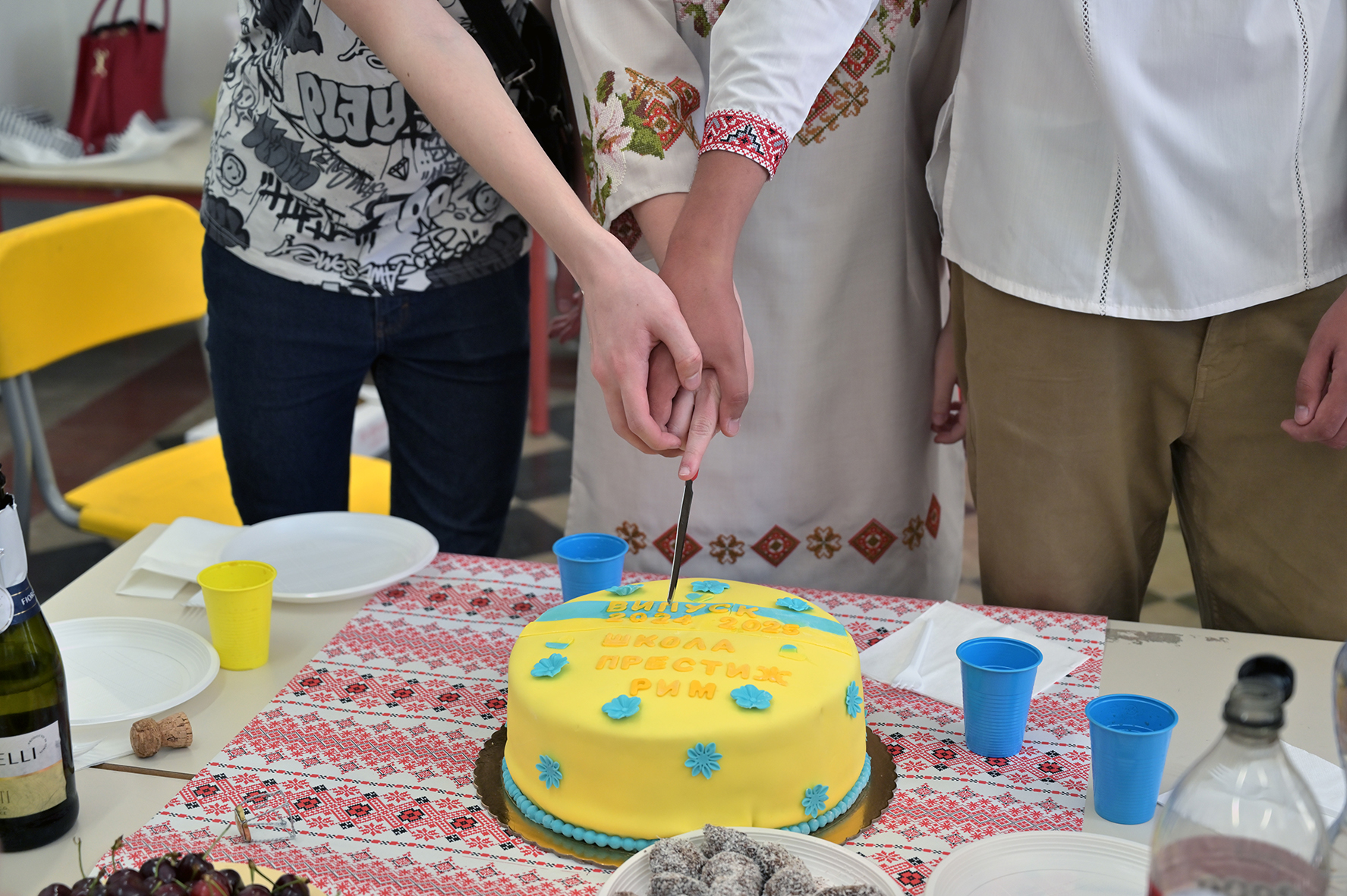 “Sono a Roma da più di vent’anni, prima lavoravo in pizzeria, mi conoscevano tutti” racconta Alina, che parla un perfetto romanesco, “ Avevo casa fuori Leopoli, in campagna, ora ci vive mia figlia grande col marito e i tre figli piccoli, mentre i maschi sono riuscita a farli arrivare a Roma prima che scoppiasse la guerra. I Maschi grandi hanno studiato: uno è laureato in Economia e ha un buon lavoro, l’altro pure lavora e già vive per conto suo” prosegue tranquilla, dopo il taglio della torta gialla e blu, come la bandiera, e il brindisi che ripaga alunni e docenti dell’impegnativa mattinata appena trascorsa. “ Paolo è il più piccolo, ha sedici anni ed è arrivato a Roma appena è scoppiata la guerra, frequenta la scuola italiana, un istituto tecnico ed ha recuperato moltissimo, quest’anno non ha avuto nemmeno l’insegnante di sostegno però vuole venire qui, perché per lui questa è la sua scuola, vede i suoi amici, parla ucraino.” Paolo è un ragazzo alto e serioso, il più alto degli alunni presenti ed è stato l’alfiere che ha portato, orgogliosamente, la bandiera dell’Ucraina sul palco, insieme ad una compagna. “Non ho amici italiani, non mi trovo tanto bene con i miei compagni di classe, mi sento diverso” confessa e la mamma aggiunge” E’ più grande dei suoi compagni, le situazioni che ha vissuto l’hanno fatto cresce prima. Ad esempio, ha saputo di mio nipote che è stato prigioniero dei russi pe due anni, da quando è tornato non sta più bene, ha bisogno dello psicologo“ poi ancora “Non credo proprio che le guerra possa finire presto, non mi fido di Putin: prima ha detto che avrebbe fatto la tregua poi ha continuato a bombardare i territori ucraini, io credo che ci prenda in giro.” E’ difficile, in effetti, non essere d’accordo con Alina.