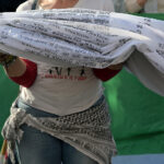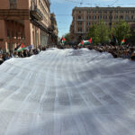 “Quanto può pesare un pezzo di stoffa? Credo che nessuno di noi, prima di oggi, avesse compreso, fisicamente, quanto può essere pesante un sudario come questo.“ Afferma Paola Caridi, saggista e giornalista, madrina del sudario laico, come da lei stessa definito, che il 10 aprile, ha sfilato a Roma, da Piazza Vittorio al cimitero del Verano. Un telo bianco lungo 25 metri x 8, realizzato dal Collettivo di Carnia per la Pace per Gaza, che ha trascritto, a mano, i nomi degli oltre 18.000 bambini e bambine uccisi da Israele a Gaza.