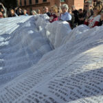 “Questo sudario laico fa il suo cammino per l’Italia, è stato in buona parte delle città e cittadine del Friuli Venezia Giulia, è andato a Firenze, Torino e Bologna, in provincia di Napoli e ci sono già altre città che mi hanno chiesto di metterli in contatto con l’associazione.” racconta ancora Paola Caridi “Questo sudario non è completo, mancano i nomi di circa tremila bambini uccisi a Gaza dal luglio 2025 ad oggi, l’ultima due giorni fa, Retaj Reihan, una bambina di 9 anni, uccisa da un cecchino in una tenda del campo profughi durante le ore di scuola. Però è importante perché mostra un disagio. Quello che noi di Ultimo giorno di Gaza chiamiamo il sussurro. Il disagio di tutte quelle persone che si oppongono al genocidio, il crimine più efferato che Israele sta compiendo sui palestinesi. A fronte di una politica, soprattutto della destra che non dice nulla sul genocidio, c’è una presenza trasversale, molto più consistente di quanto si creda, che non è di destra né di sinistra che è contro il genocidio che dice ”non in nostro nome.”