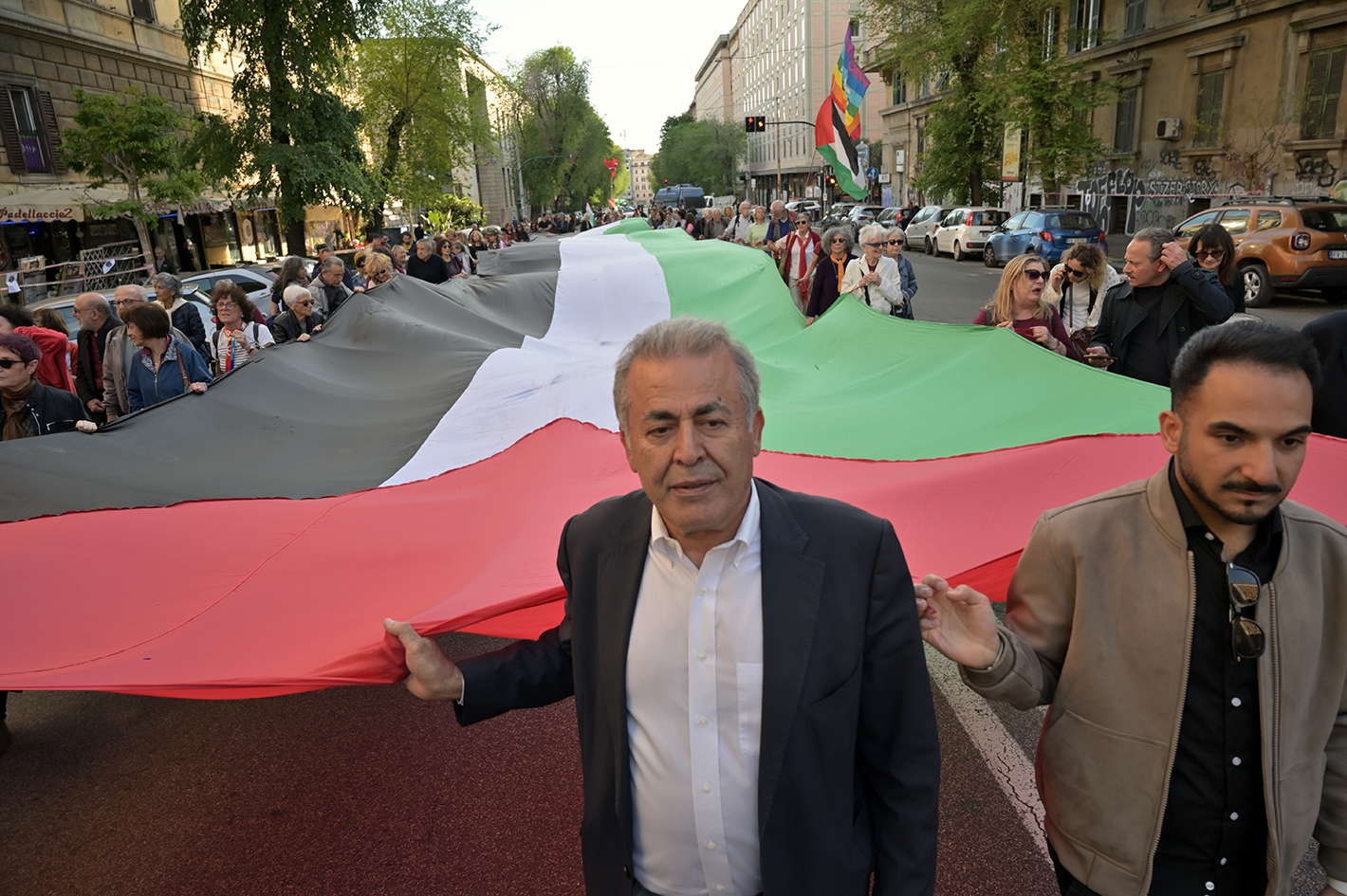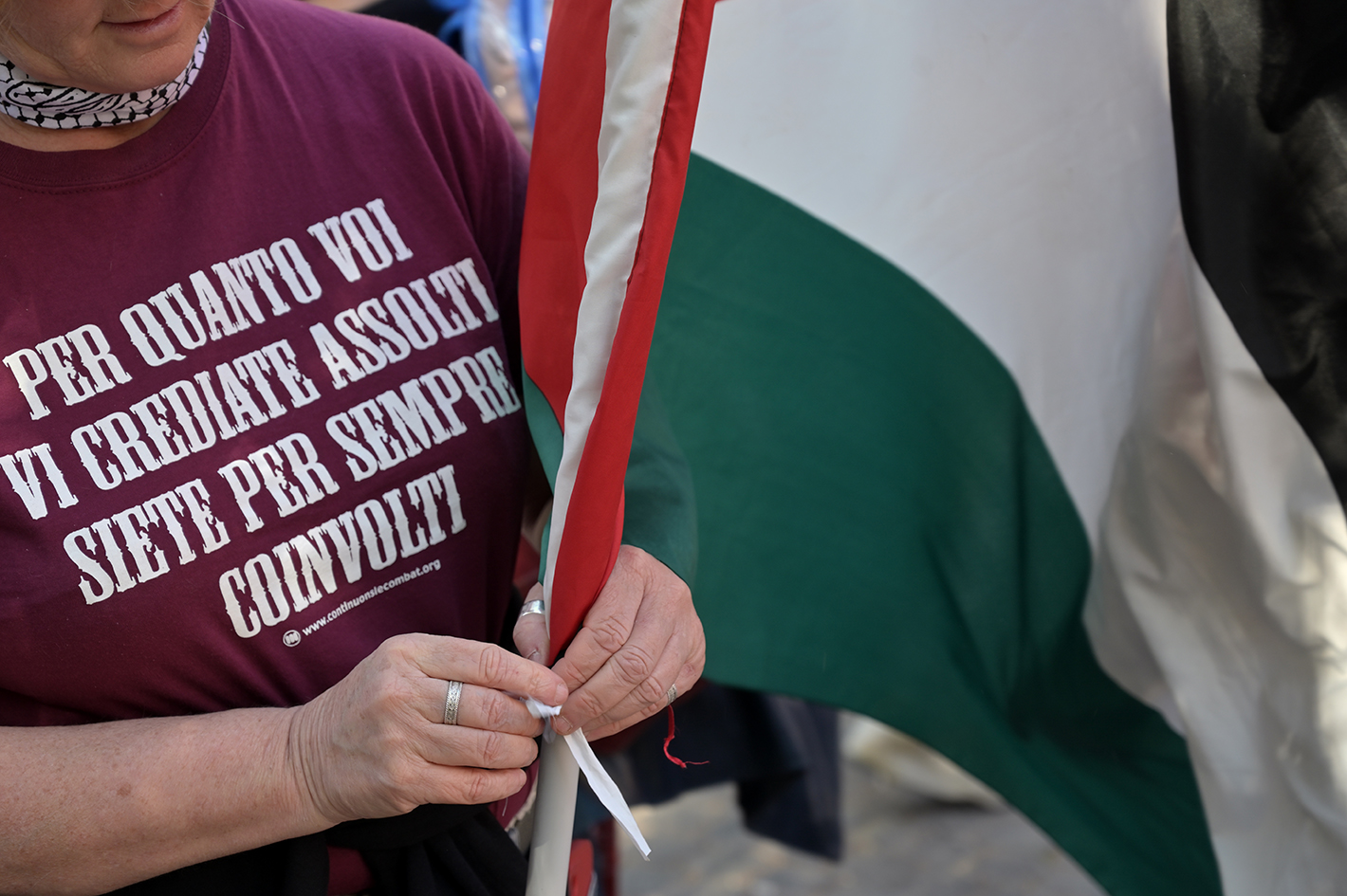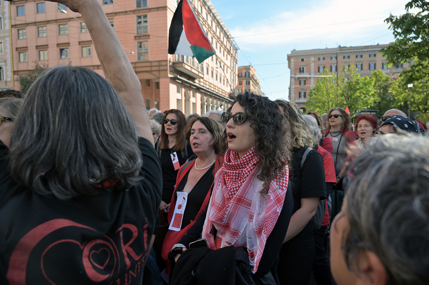 Quasi alla fine del corteo, una ragazza, ferma ai bordi della strada, con il capo velato e con gli occhi colmi di lacrime, attira l’attenzione delle persone che sfilano. Alcuni si fermano, le vanno incontro e le parlano. Lei guarda incredula il corteo, è una studentessa universitaria, ha vinto una borsa di studio ed è da poco tempo a Roma. Non parla bene l’italiano ma si fa capire. “Ho riconosciuto la bandiera palestinese e quasi non ci credevo. Tutte queste persone sfilano per noi.” dice tra le lacrime, “Per la prima volta, da quando sono in Italia, vedo un corteo per la Palestina” molti l’abbracciano e le chiedono se ha bisogno di aiuto, la invitano a seguire il corteo ma lei rifiuta: “Ho troppo dolore, ho visto morire troppi amici, troppe persone, non posso venire, non ce la faccio a sostenere altro dolore”.