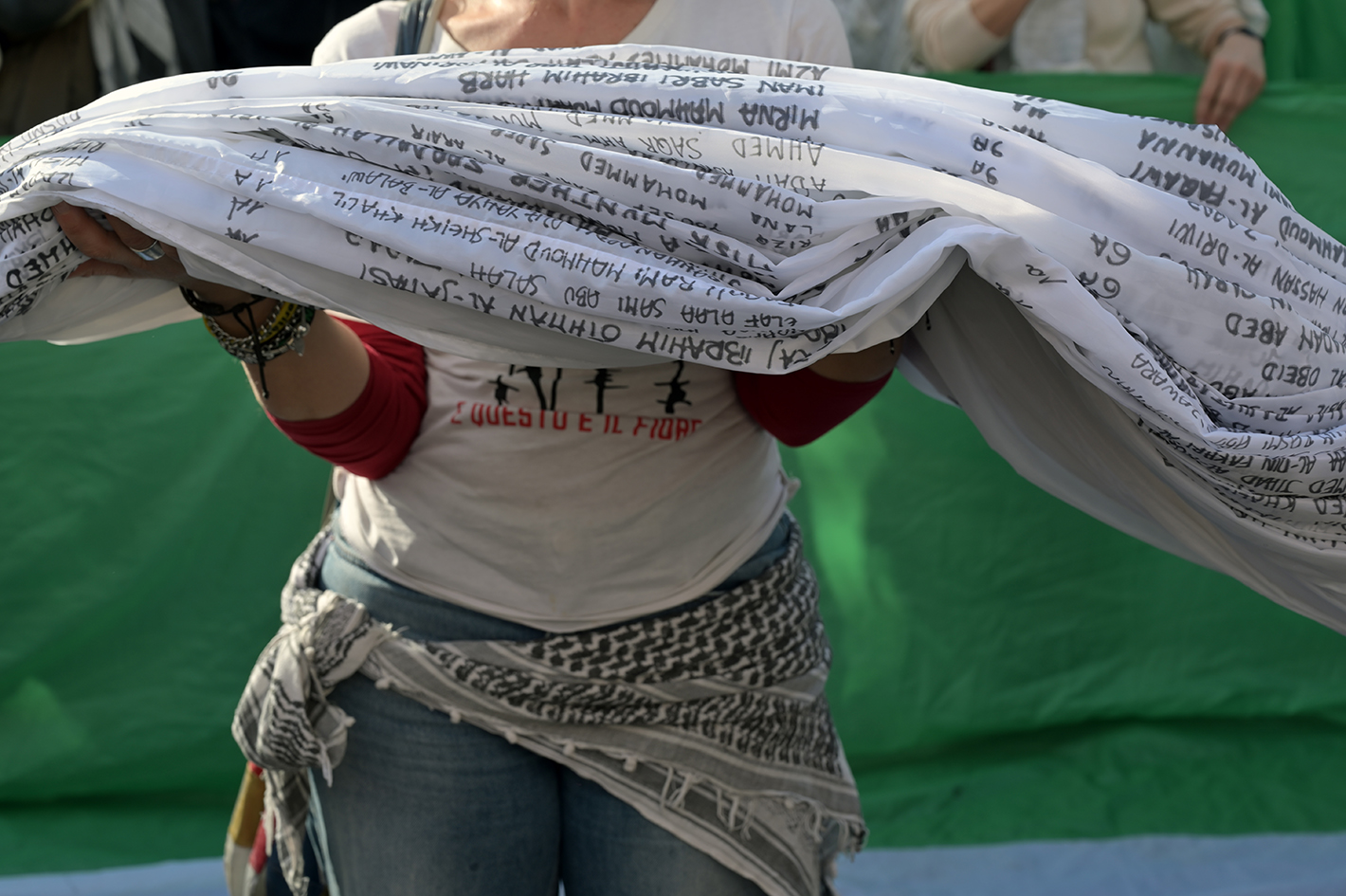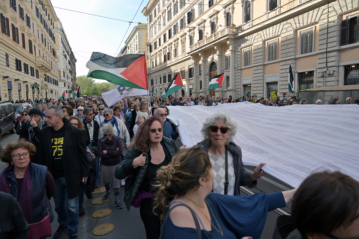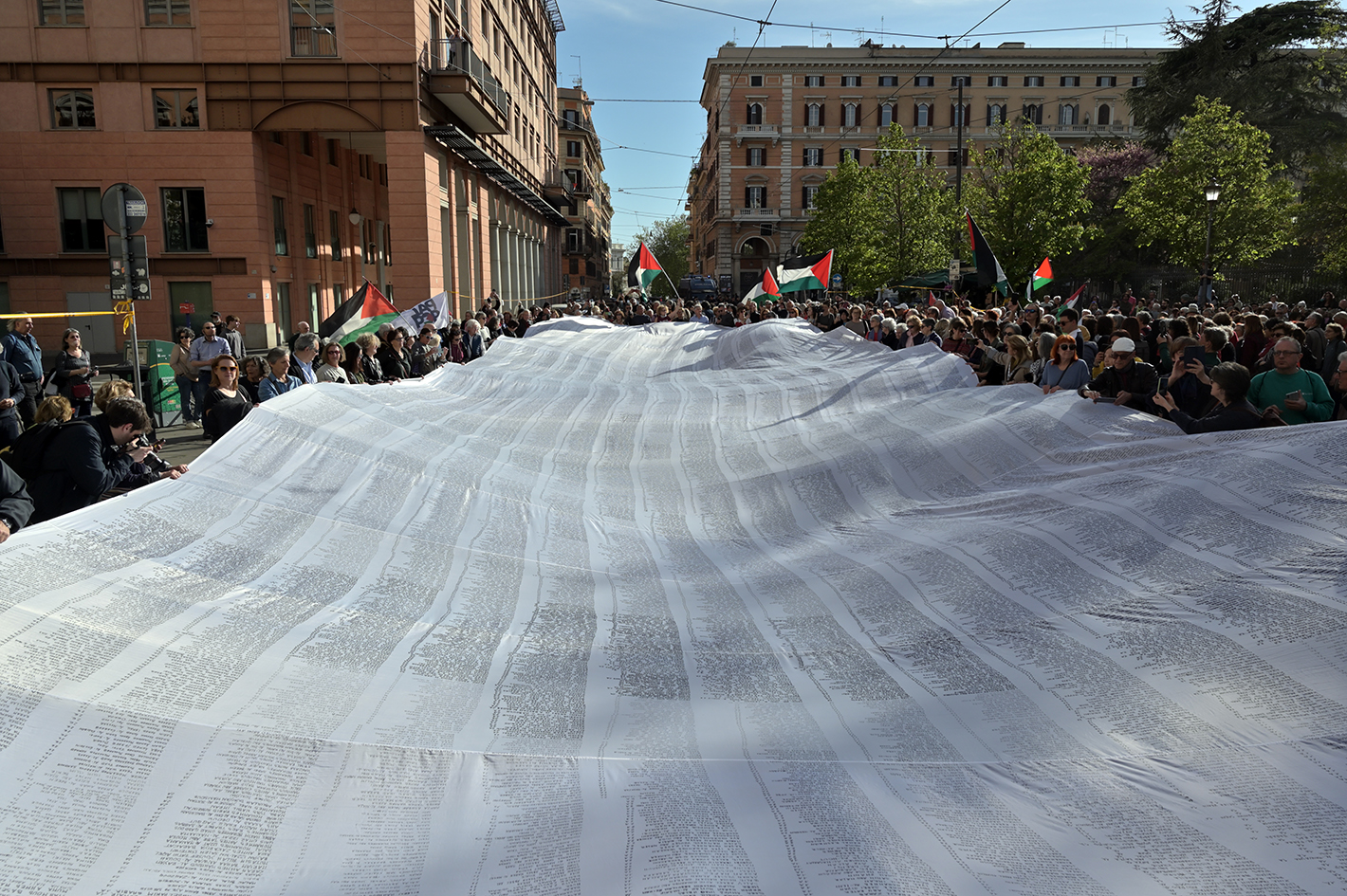 “Quanto può pesare un pezzo di stoffa? Credo che nessuno di noi, prima di oggi, avesse compreso, fisicamente, quanto può essere pesante un sudario come questo.“ Afferma Paola Caridi, saggista e giornalista, madrina del sudario laico, come da lei stessa definito, che il 10 aprile, ha sfilato a Roma, da Piazza Vittorio al cimitero del Verano. Un telo bianco lungo 25 metri x 8, realizzato dal Collettivo di Carnia per la Pace per Gaza, che ha trascritto, a mano, i nomi degli oltre 18.000 bambini e bambine uccisi da Israele a Gaza.