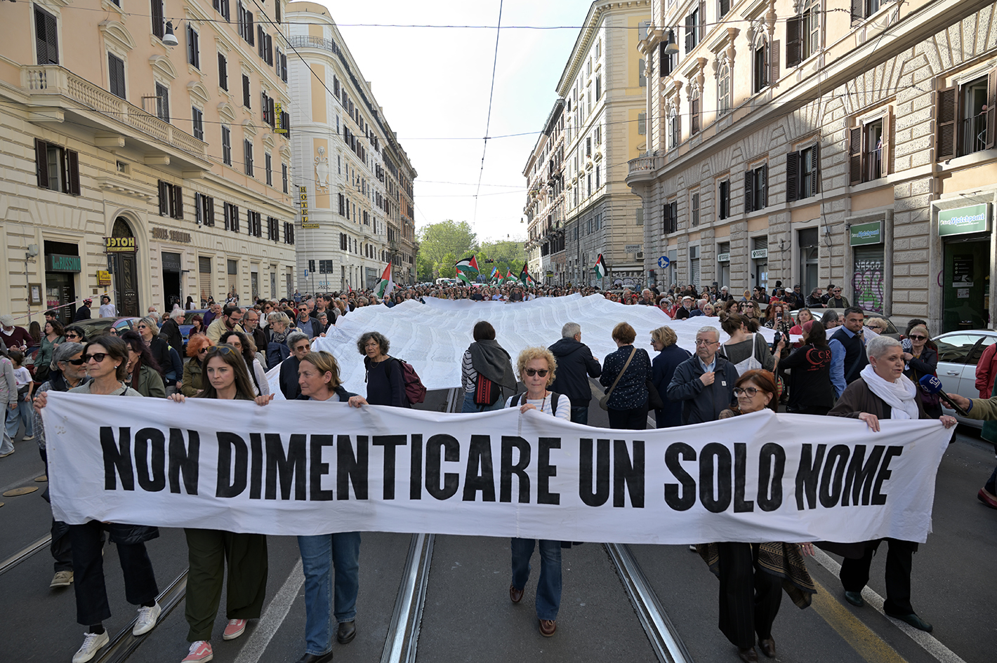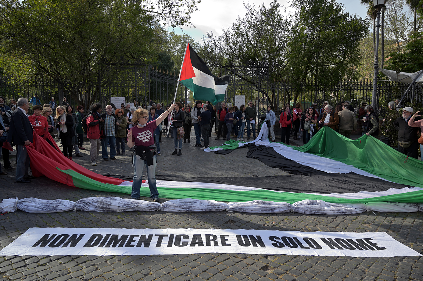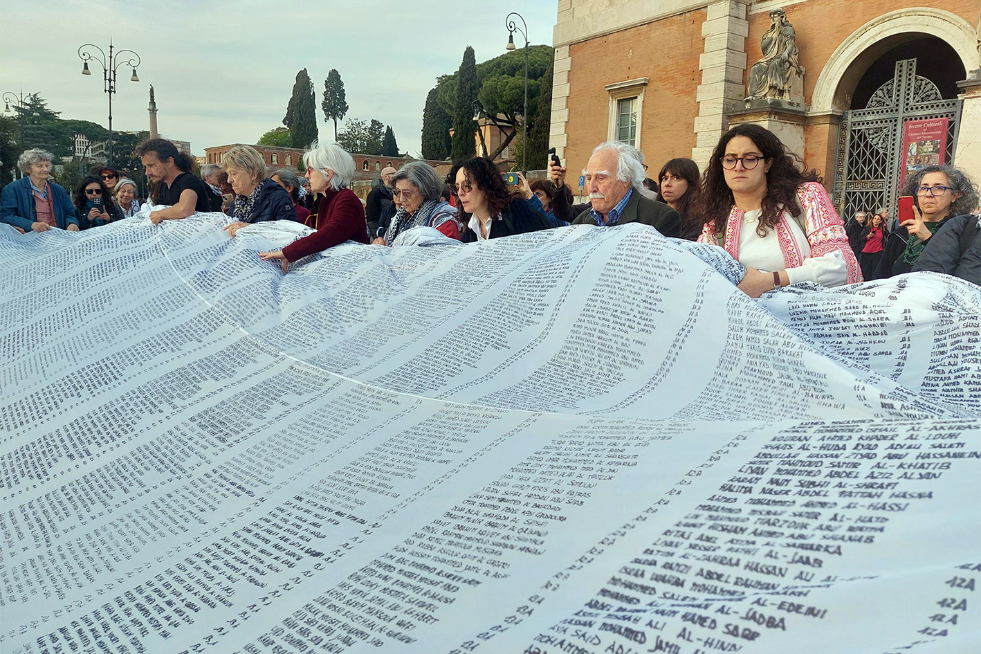 “Un archivio della dignità, nomi, storie, biografie che fanno parte di tutti noi per sempre, un sudario che copre tutti e tutte noi dalla sconcezza di questo tempo, in cui non fa scandalo compiere un genocidio ed esportare Gaza, diventata una vera e propria dottrina di annientamento, anche in altri luoghi come Beirut e Teheran” ha continuato Paola Caridi, in un clima di commozione che ha lentamente pervaso tutti, soprattutto quando, giunti di fronte al Cimitero monumentale del Verano, attori e organizzatori dell’evento si sono alternati nella lettura di alcuni dei nomi degli uccisi: alcuni di loro avevano pochissimi mesi, anche un solo giorno di vita.