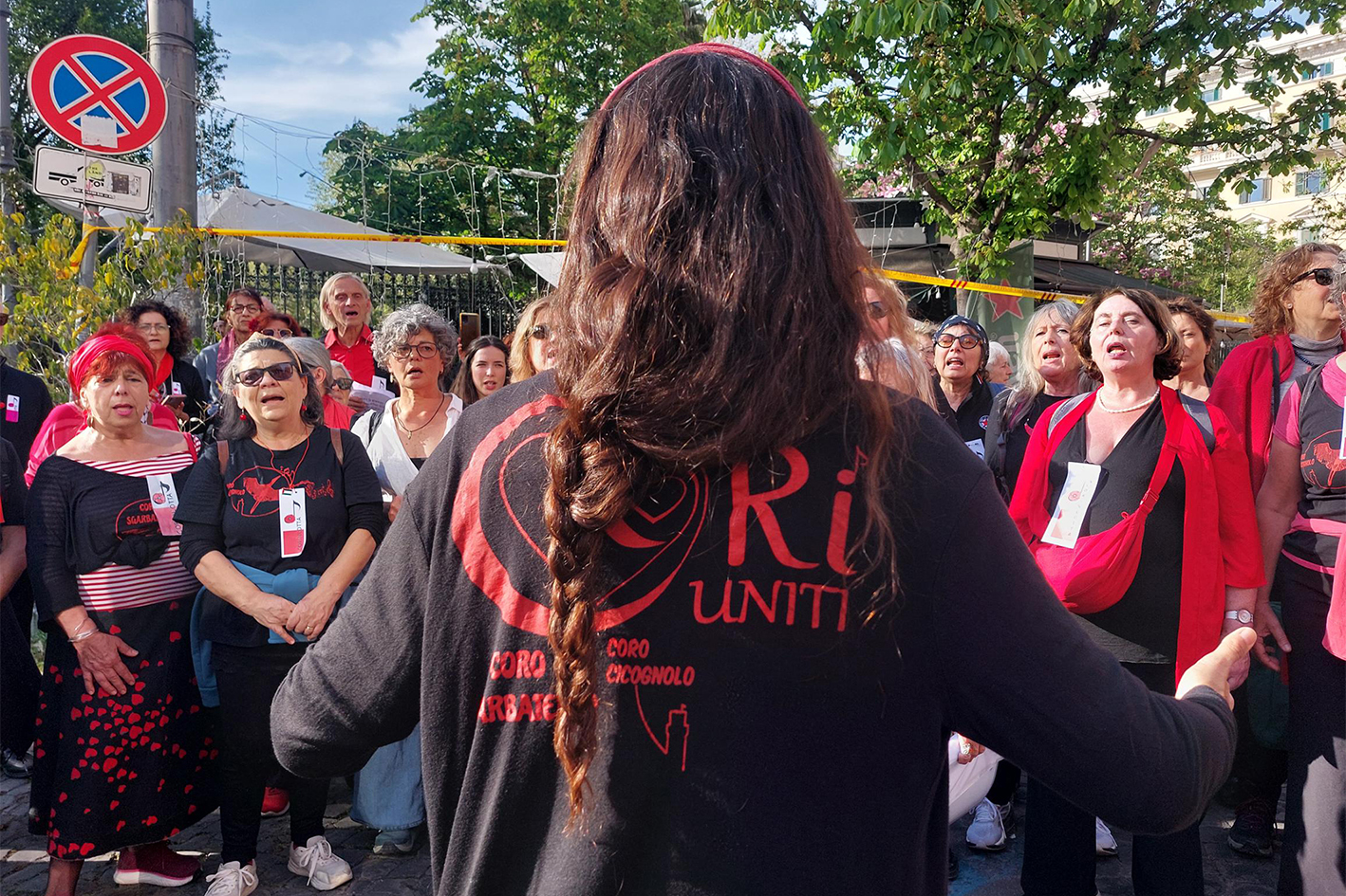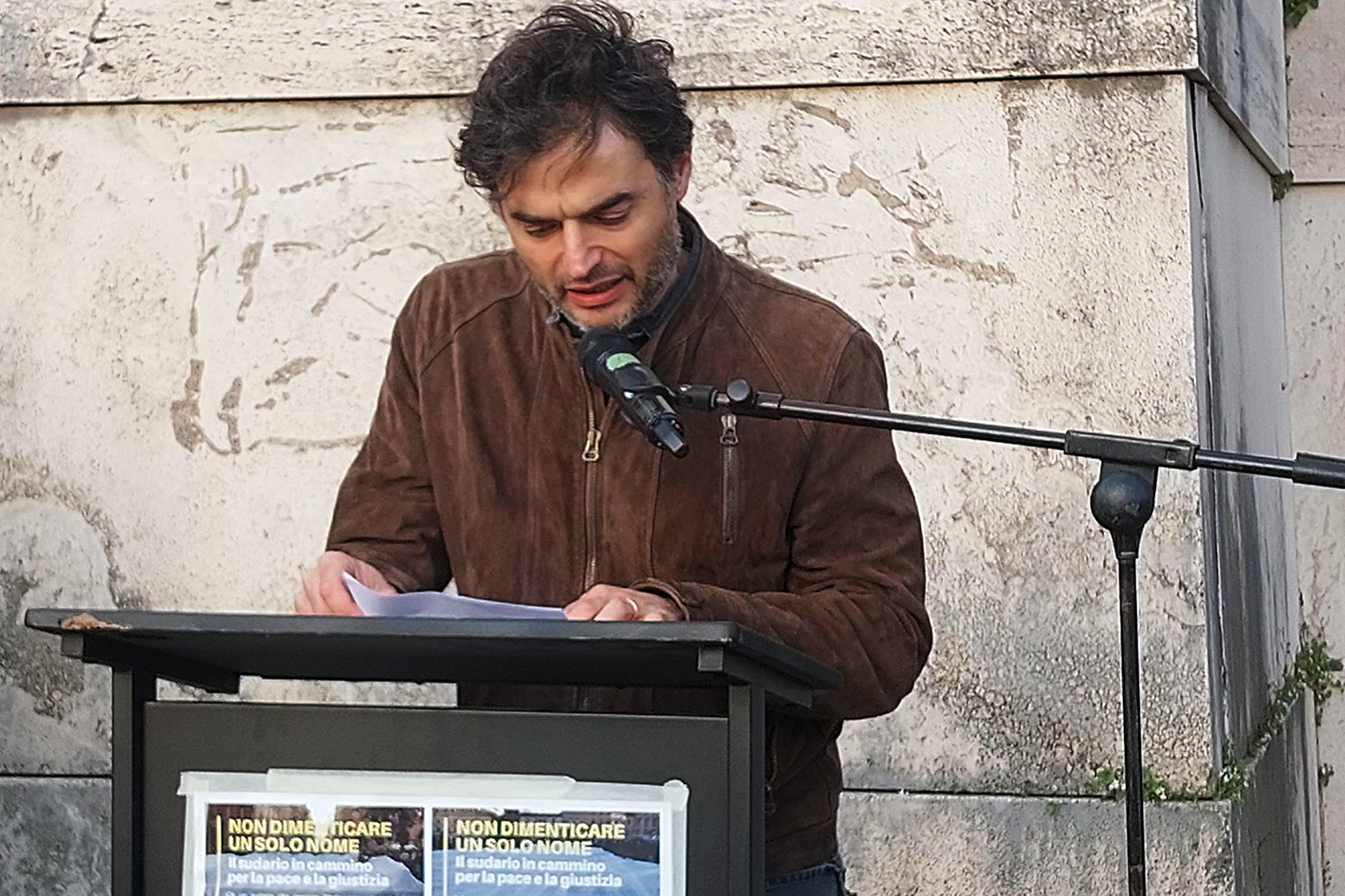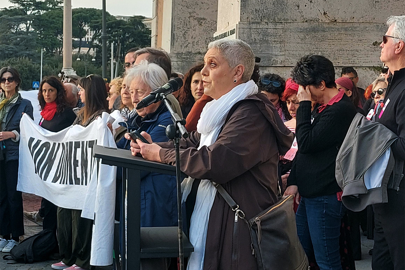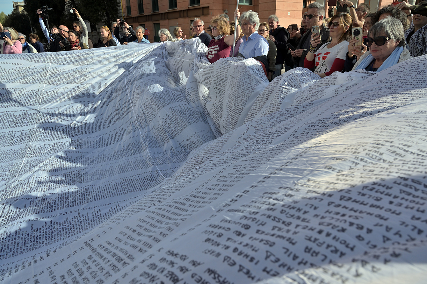 “Un archivio della dignità, nomi, storie, biografie che fanno parte di tutti noi per sempre, un sudario che copre tutti e tutte noi dalla sconcezza di questo tempo, in cui non fa scandalo compiere un genocidio ed esportare Gaza, diventata una vera e propria dottrina di annientamento, anche in altri luoghi come Beirut e Teheran” ha continuato Paola Caridi, in un clima di commozione che ha lentamente pervaso tutti, soprattutto quando, giunti di fronte al Cimitero monumentale del Verano, attori e organizzatori dell’evento si sono alternati nella lettura di alcuni dei nomi degli uccisi: alcuni di loro avevano pochissimi mesi, anche un solo giorno di vita.
